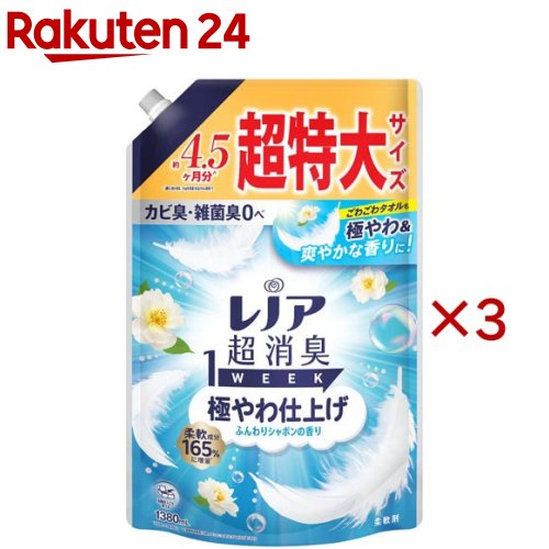 お店TOP>日用品>洗濯用品>柔軟剤>柔軟剤>レノア 超消臭1WEEK 柔軟剤 極やわ仕上げ ふんわりシャボンの香り 詰め替え 超特大 (1380ml×3セット)【レノア 超消臭1WEEK 柔軟剤 極やわ仕上げ ふんわりシャボンの香り 詰め替え 超特大の商品詳細】●湿気から衣類を守る! カビ臭・雑菌臭0へ※●ごわごわタオルも極やわ&爽やかな香りに!●柔軟成分165%に増量※1 ●1週間ずーっと消臭※2 ●花粉ブロック※3 静電気ブロック●部屋干しでも生乾き臭を防ぐ●洗濯槽のニオイを防ぐ●赤ちゃんの衣類もやわらかく※柔軟剤未使用と比較。すべてのニオイを0にするわけではありません※1 メーカー他レノア超消臭比※2 保管状態で※3 静電気を防ぐ効果による●柔軟剤【使用方法】★ボトルへのつめかえ方(1)開ける。つめかえ口の付け根部をしっかり持ってキャップを矢印の方向にまわして開けてください。※開ける際にはキャップの切り口と液の飛び出しに気をつけてください。(2)注ぐ。つめかえ袋の上部と底を両手で持ち、ゆっくり注ぎいれてください。・ボトルの注ぎ口の高くなった部分に、袋の注ぎ口を斜めに当てて注ぐと、注ぎやすくなります。・目安ラインを参考に注ぐ量を調節してください。・つめかえる場合は、全部使い切ってからそのまま洗わずつめかえてください。★重要・ご使用の際には「水30Lあたり15mL」で設定ください(普段のお洗濯:衣料1kgに6.4mL)。・適正量を使用しましょう。・レノア超消臭1WEEK 極やわ仕上げ「ふんわりシャボンの香り」のボトルにつめかえてください(他の製品や洗剤と混ざると液が固まることがあります)。・つめかえた後は、ボトルの表示をよく読んでお使いください。【成分】界面活性剤(エステル型ジアルキルアンモニウム塩)、安定化剤、香料【注意事項】・香りの感じ方には個人差があります。・使用量の目安を参考に、周囲の方にもご配慮の上、お使い下さい。・飲み物ではありません。★使用上の注意・子供や認知症の方の手の届く所に置かない。・用途外に使用しない。・洗剤、漂白剤などとは混ぜない。・生分解性の界面活性剤を使用の為、保管状況によって固まることがあります。・高温、低温、直射日光を避けて保管し、できるだけ早く使用してください。・原液が洗濯機のステンレス部分、床などについたときは水ですぐふきとる。・原液が直接衣類にかからないようにする。・小さくして捨てやすい、やわらかい素材を使用しています。・開封前の破損や液漏れに注意してお取り扱いください。・窒息の原因になる可能性がありますので、容器キャップは常に固く締め、お子様が誤って口にいれないようにしてください。★応急処置・目に入ったときには十分に洗い流す。・飲み込んだときは吐かずにすぐ口をすすぎ、水を飲むなどの処置をする。・異常が残る場合は医師に相談する。【原産国】日本【ブランド】レノア超消臭【発売元、製造元、輸入元又は販売元】P&G(プロクター&ギャンブル)※説明文は単品の内容です。商品に関するお電話でのお問合せは、下記までお願いいたします。受付時間9:15-17:00(月-金曜日、祝日・年末年始を除く)衣料用洗剤・柔軟仕上げ剤:0120-021321食器用洗剤・布製品消臭剤・置き型消臭剤:0120-118226乳幼児用紙おむつ:0120-021329ヘアケア製品:0120-021327マックスファクター化粧品:0120-021325男性用・女性用グルーミング製品:0120-113937ブラウン製品(シェーバー、オーラルケア製品、脱毛器)のお問い合わせにつきましては、下記までお願いいたします。受付時間9:00-17:30(月-金曜日、祝日・年末年始を除く) 0120-136343リニューアルに伴い、パッケージ・内容等予告なく変更する場合がございます。予めご了承ください。・単品JAN:4987176324559P&G(プロクター&ギャンブル)651-0088 兵庫県神戸市中央区小野柄通7丁目1番18号 ※お問合せ番号は商品詳細参照広告文責:楽天グループ株式会社電話:050-5577-5043[柔軟剤/ブランド:レノア超消臭/]