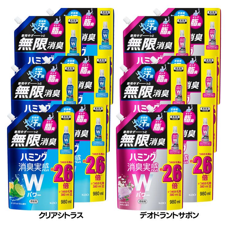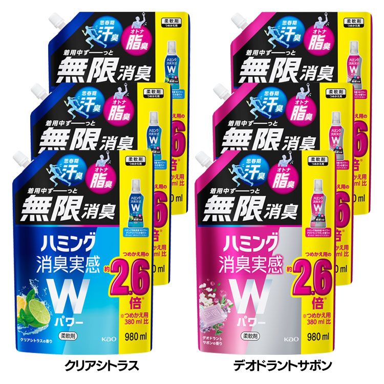 思春期汗臭・オトナ脂臭を着用中ずーっと無限消臭! 手ごわいニオイを消臭しつづけます。 ・クリアシトラスの香り:シトラス香る爽やかな清潔感 ・デオドラントサボンの香り:ハーブ香るスッキリ消臭感 ※リニューアルに伴い、パッケージ・内容等予告なく変更する場合がございます。予めご了承ください。 ●セット内容:980ml(つめかえ用)×6個 ●商品サイズ(1個あたり/cm):幅約20×奥行約12×高さ約28 ●成分:界面活性剤(エステル型ジアルキルアンモニウム塩、ポリオキシエチレンアルキルエーテル)、香料、安定化剤 ●使用上の注意・応急処置:パッケージ裏面もしくは花王公式サイトをよくご確認の上、ご使用下さい。 (検索用:柔軟仕上げ剤 花王 無限消臭 汗臭・油臭 詰め替え用 まとめ買い 加齢臭 部屋干し 花粉ブロック ダブルパワー 4901301430922 4901301430915) 最強翌日配送対象商品に関するご案内 最強翌日配送対象商品・対象地域に該当する場合は最強翌日配送マークがご注文カゴ近くに表示されます。 最強翌日配送可能なお支払方法は【クレジットカード、代金引換、全額ポイント支払い】のみとなります。 下記の場合は最強翌日配送対象外となります。 ・15点以上ご購入いただいた場合 ・時間指定がある場合 ・ご注文時備考欄にご記入がある場合 ・決済処理にお時間を頂戴する場合 ・郵便番号や住所に誤りがある場合 ・最強翌日配送対象外の商品とご一緒にご注文いただいた場合 ・お届け先住所文字数が40文字以上の場合
