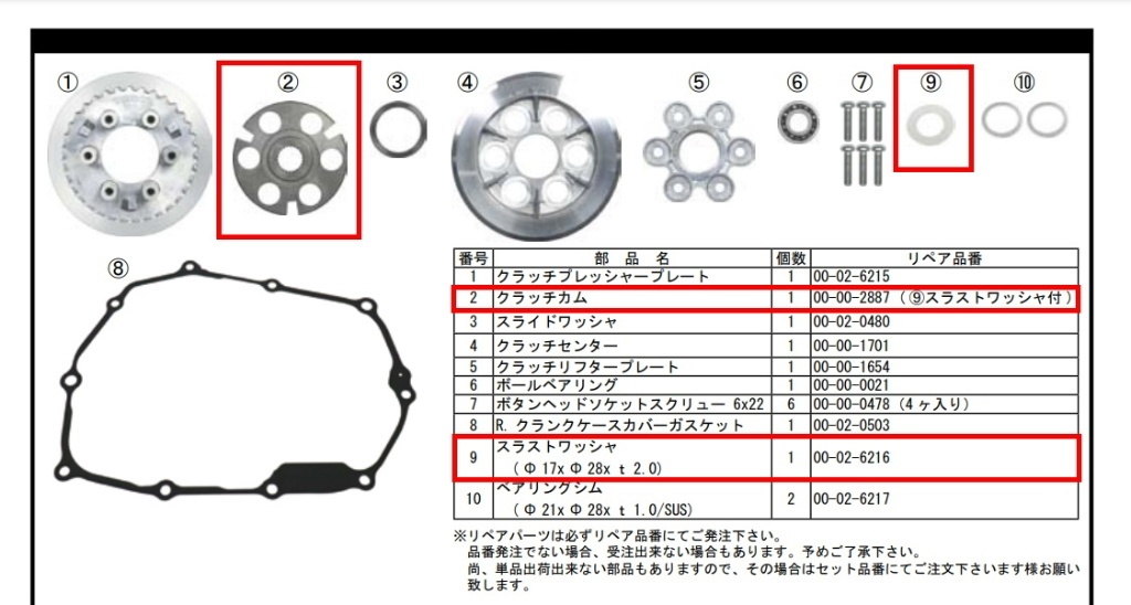 ■商品概要・リフタープレート×1・加工済みクロモリボルト×6・強さ調整用ワッシャー×6■詳細説明クラッチスプリングの'振動'と摺動のフリクションロスを低減させ、よりクラッチを正確に作動させ、タッチの向上、スムーズな操作感になります。握りをソフトにも出来ます。付属のワッシャー無しでSPリフタープレートを組むと、ノーマルよりスプリングを潰す量が1.0mm減るので握りが『ソフト、でも繋がりは強く』になります。付属の1.0mmワッシャーをクラッチセンターの上、スプリングの下に入れていただくと握りが、『純正とほぼ同じ握りの重さになり、繋がりがより強く』になります。・吉良選手によると、一般の方はワッシャー無しソフトがお勧めとの事です。【画像説明】1.セット内容。2.スプリングがしっかり嵌り込み、振動を本体に伝えません。この1mm分スプリングを圧縮する量が減り、握りが軽くなりますが、振動を抑えたスムーズな作動により、タッチが向上します。3.4.加工済みクロモリボルトがしっかりとSPリフタープレートに嵌り込み、組み込み精度が上がり作動がしっかりします。5.この図の13280Aと92154×6本を組み替えます。この92145の6本のスプリングは長い針金を丸めた物なので、必ず振動します。その振動を抑え、クラッチ本体を揺らさないようにします。■注意点※メーカー都合により商品の仕様変更がある場合がございます。ご了承ください。■適合車種KLX230R KLX230R  備考: (R.S.SM.全タイプ)KLX230 KLX230  備考: (R.S.SM.全タイプ)KLX230S KLX230S  備考: (R.S.SM.全タイプ)KLX230SM KLX230SM  備考: (R.S.SM.全タイプ)