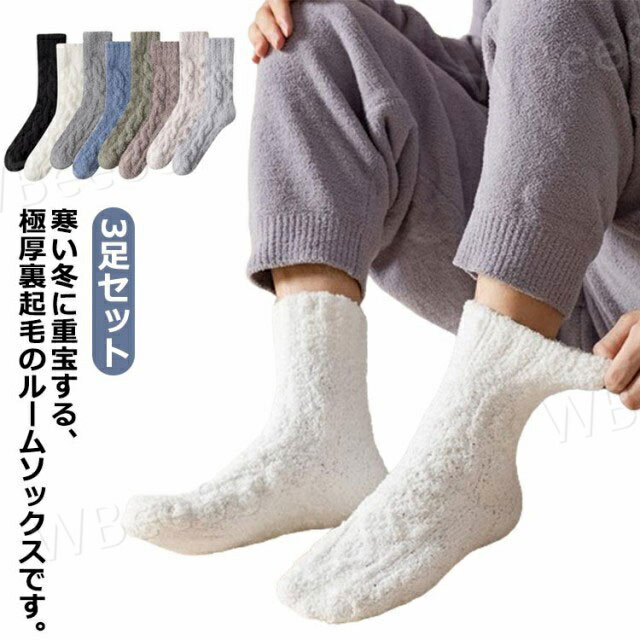 足元からの冷えを解消するお助けアイテム◎寒い冬、暖かいもこもこソックス。優しく足元を包んでくれて、心までぽかぽかに♪程よいボリューム感も抜群で足元をしっかり暖めます。冷たいフローリングも気にならない!このもこもこ感がたまらない、ふわふわで柔らかい冬の定番アイテム。よく伸びる素材で窮屈感なくふわりとした履き心地です。寒がりなご家族や、お友達、大切な方へのプレゼントに。ペアで着用したり、何足がお揃えておくのもおススメです。 サイズ 3足セット サイズについての説明 F 24.5〜27.5cm 素材 ポリエステル&ポリウレタン 色 カラー1 カラー2 カラー3 カラー4 カラー5 カラー6 カラー7 カラー8 備考 ●サイズ詳細等の測り方はスタッフ間で統一、徹底はしておりますが、実寸は商品によって若干の誤差(1cm〜3cm )がある場合がございますので、予めご了承ください。 ●製造ロットにより、細部形状の違いや、同色でも色味に多少の誤差が生じます。 ●パッケージは改良のため予告なく仕様を変更する場合があります。 ▼商品の色は、撮影時の光や、お客様のモニターの色具合などにより、実際の商品と異なる場合がございます。あらかじめ、ご了承ください。 ▼生地の特性上、やや匂いが強く感じられるものもございます。数日のご使用や陰干しなどで気になる匂いはほとんど感じられなくなります。 ▼同じ商品でも生産時期により形やサイズ、カラーに多少の誤差が生じる場合もございます。 ▼他店舗でも在庫を共有して販売をしている為、受注後欠品となる場合もございます。予め、ご了承お願い申し上げます。 ▼出荷前に全て検品を行っておりますが、万が一商品に不具合があった場合は、お問い合わせフォームまたはメールよりご連絡頂けます様お願い申し上げます。速やかに対応致しますのでご安心ください。