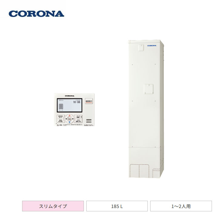 【法人名必須】【UWH-18X1N1L2+RMH-EN15+UWH-AKB3】コロナ 電気温水器 給湯専用タイプ 標準圧力型 スリムタイプ 185L(1〜2人用) 本体+リモコン+脚部カバー 3点セット 受注生産品 CORONA ※品番にて注文をさせていただきます。メーカーにて品番の確認をお願いいたします。画像はイメージです。 少人数世帯向け賃貸住宅に最適。 ●外形寸法:高さ 1,890 mm / 幅 450 mm / 奥行 550 mm ●質量:約47kg(満水時232kg) ●1ヒーター ●屋内外兼用 ●絶縁パイプレス仕様 ●標準圧力 ※本製品は受注生産品です。標準納期は受注後3ヶ月です。