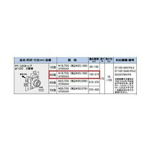 【0700243】ノーリツ FF-120トップ Φ120 200型 給排気トップ(2重管) 【NORITZ】※品番にて注文をさせていただきます。メーカーにて品番の確認をお願いいたします。画像はイメージです。●適応壁厚:130-210mm●壁穴:Φ170●飛出寸法:75-105mm●【対応機種】GT-1651AWX-FFAGT-1651SAWX-FFAGQ-2437WS-FFA●※近接設置する場合は「90°エルボ」では対応不可のため、必ずFF-120トップとFF-120Aアダプターを組み合わせてご使用下さい。