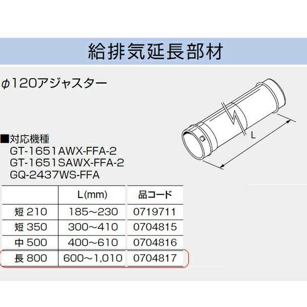 【0704817】ノーリツ 排気延長部材 Φ120 アジャスター 長 800 【NORITZ】※品番にて注文をさせていただきます。メーカーにて品番の確認をお願いいたします。画像はイメージです。●L=600?1010mm●【対応機種】GT-1651AWX-FFA-2GT-1651SAWX-FFA-2GQ-2437WS-FFA