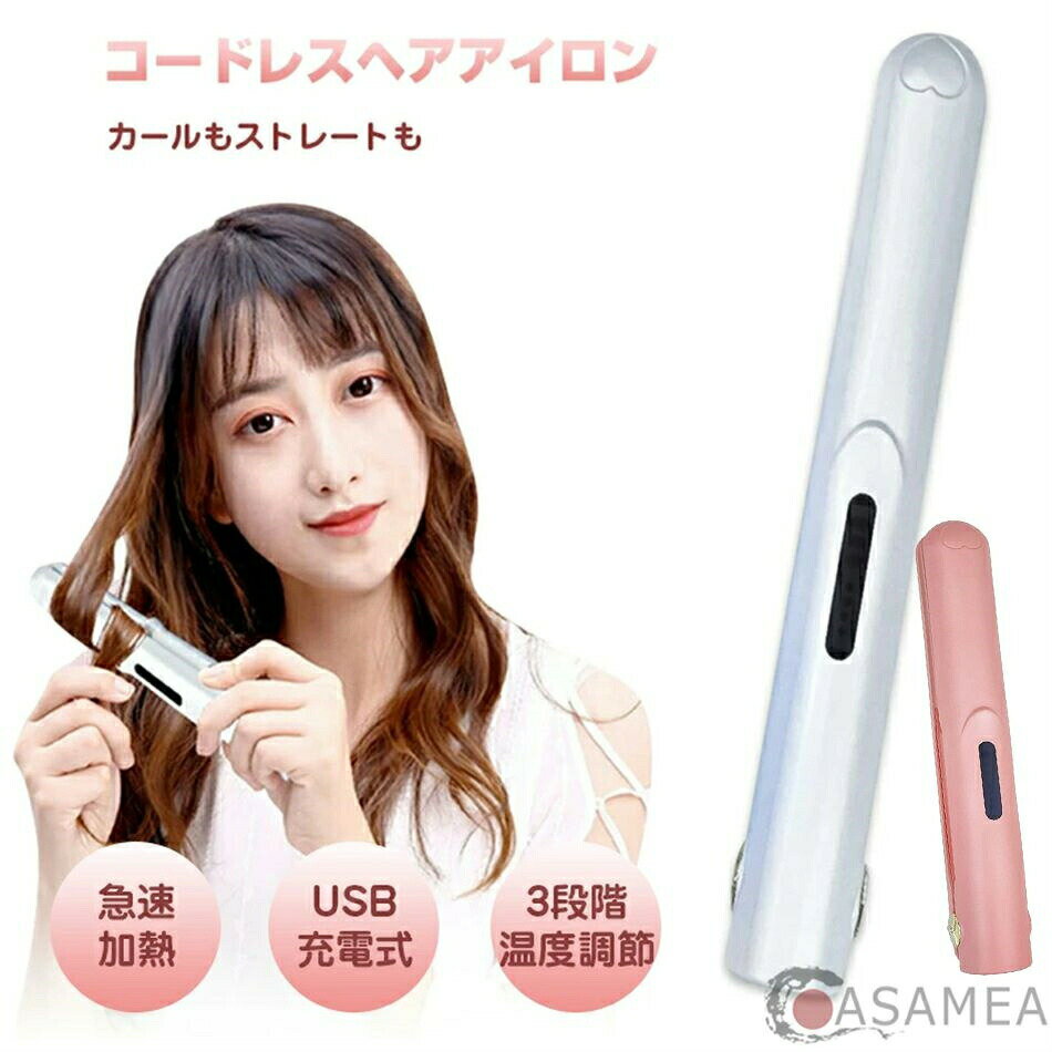 商品について 【3段階温度調節】 プロ仕様のヘアアイロンとして、160℃から200℃まで髪の状態や髪質に合わせて適切な温度に調節でき、温度指示ライトが付き、設定された温度を一目で分かり、過熱しないように知能的な温度制御チップが付き、髪の毛を傷つける心配が無く、安心して利用できます。 【ストレート&カール2way仕様】 ストレート・カールへの切替は自由です。このヘアアイロン一本で、ストレートだけでなくカールや外ハネヘアも可能です。縮毛矯正レベルの200℃を実現し、ご気分に合わせて髪スタイルの変更が簡単になります。 【マイナスイオンセラミック材質】 セラミックコーティングプレート式ヘアアイロン、導熱性に優れ、髪の潤いと艶を与えながら、髪質を損傷せずに美しいカールを作れる。引っかかりにくいなめらかな仕様で、髪にやさしくアレンジをスムーズに行うことができます。 【コードレス&持ち運びに便利】 コードレスのため、使用中に絡まる心配がありません。USB充電式なのでどこでも使えます。ミニサイズなので持ち転びやすく、カバンなどに入れても場所をとりません。忙しい朝でも、旅行/出張/デート前でも、スタイリングがすぐできます。注:機内持ち込み・お預けともにできませんのでご了承ください。 【急速加熱&安全】 プレート表面にはプロ仕様のセラミックコーティングが付き、滑りが良く、耐久性や熱伝導にも優れており、短時間でツヤサラに仕上がります。忙しい朝やデート前のちょっとした時間でも、スタイリングが可能です。ヘアアイロンの先端部にヤケド防止の設計があり、もっと安全に使用いただけます。 商品について 【3段階温度調節】 プロ仕様のヘアアイロンとして、160℃から200℃まで髪の状態や髪質に合わせて適切な温度に調節でき、温度指示ライトが付き、設定された温度を一目で分かり、過熱しないように知能的な温度制御チップが付き、髪の毛を傷つける心配が無く、安心して利用できます。 【ストレート&カール2way仕様】 ストレート・カールへの切替は自由です。このヘアアイロン一本で、ストレートだけでなくカールや外ハネヘアも可能です。縮毛矯正レベルの200℃を実現し、ご気分に合わせて髪スタイルの変更が簡単になります。 【マイナスイオンセラミック材質】 セラミックコーティングプレート式ヘアアイロン、導熱性に優れ、髪の潤いと艶を与えながら、髪質を損傷せずに美しいカールを作れる。引っかかりにくいなめらかな仕様で、髪にやさしくアレンジをスムーズに行うことができます。 【コードレス&持ち運びに便利】 コードレスのため、使用中に絡まる心配がありません。USB充電式なのでどこでも使えます。ミニサイズなので持ち転びやすく、カバンなどに入れても場所をとりません。忙しい朝でも、旅行/出張/デート前でも、スタイリングがすぐできます。注:機内持ち込み・お預けともにできませんのでご了承ください。 【急速加熱&安全】 プレート表面にはプロ仕様のセラミックコーティングが付き、滑りが良く、耐久性や熱伝導にも優れており、短時間でツヤサラに仕上がります。忙しい朝やデート前のちょっとした時間でも、スタイリングが可能です。ヘアアイロンの先端部にヤケド防止の設計があり、もっと安全に使用いただけます。