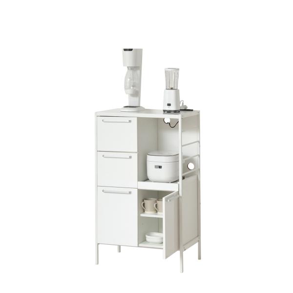 SPECスペック サイズ 本体:幅 59.8cm × 奥行 39.5cm × 高さ 87cm×4梱包サイズ:幅 61.8cm × 奥行 41.5cm × 高さ 89cm×4【重量】オープン引出60:約 25kgガラス扉60:約 25kgチェスト60:約 25kg板戸60:約 22kg カラー ナチュラル 素材 扉、引き出し前板:強化紙化粧板(チェスト60の引き出し最上段のみアルダー無垢材)取っ手:アルダー無垢材(オイル塗装)側面、背面:強化紙化粧板ガラス扉:3mm厚ガラス 耐荷重 引き出し耐荷重:15kgスライド棚耐荷重:10kg 備考 完成品(取っ手、棚のみお客様取り付け)※プラスドライバーが必要です。日本製可動棚:6cmピッチ1個口コンセントスライド棚単品購入や、横に並べて使用する際は、別売りの天板を併せてお使い下さい。別売りの天板は、連結用の穴にネジを通して固定していただけます。こちらの商品は、当店だけで販売しているオリジナル商品です。※取っ手や引き出しの前板に天然木を使用しており、木目・節が商品ごとに異なります。 カテゴリー:キッチンSHOPPING CARTショッピングカート