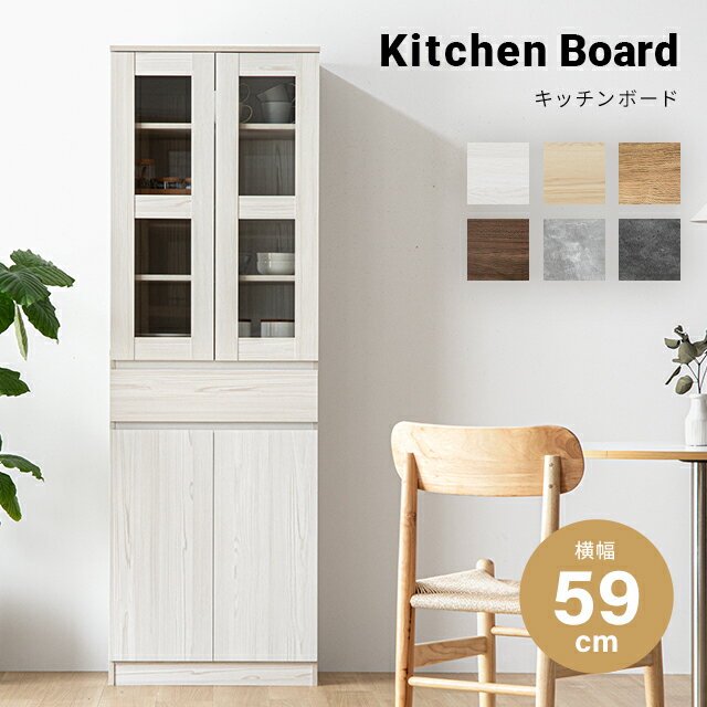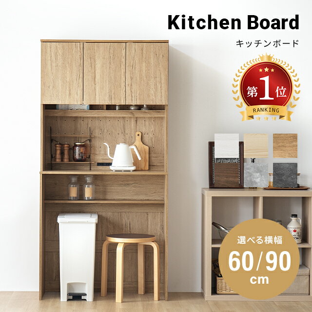 サイズ(約) 60サイズ:幅59×奥行き39.8×高さ180cm 90サイズ:幅88.5×奥行き39.8×高さ180cm 材質 パーティクルボード、MDF 重量(約) 60サイズ:33.5kg 90サイズ:45.3kg 耐荷重(約) 60サイズ: 天板:14kg 扉内棚板:12kg オープン棚:16kg 奥固定棚(オープン棚内):3.5kg 奥固定棚(下段):5.5kg 90サイズ: 天板:21.5kg 扉内棚板(大):12kg 扉内棚板(小):6kg オープン棚:24kg 収納棚:8.5kg 製品保証 3ヵ月間保証 組み立てについて 組み立てには以下の工具が必要となります ・ドライバーセット ・プラスチックハンマー ご購入前の注意事項 ・モニターにより実際の色と異なる場合がございます ・デザインや仕様は予告なく変更する場合がございます 送料 無料 沖縄・離島:お見積り 追加料金 ・別途送料がかかる地域の方 ・追加料金オプションを選択された方 ご注文時には追加料金が反映されません 「ご注文確定メール」にて改めてご案内いたします 配送 ・時間帯指定不可の商品です(開梱設置サービスを除く) ・出荷後のキャンセルや変更は別途送料が発生します 下記ページをご確認の上、ご購入ください 商品の配送について 商品情報 スッキリ収納を叶えるキッチンボード 日常使いの食器類からキッチン家電まで、スッキリと収納できるキッチンボード。可動棚やオープン棚、下段の収納スペースを利用してデッドスペースを削減した理想の収納力を発揮します。 単体でも組み合わせでもカスタム自在 コンパクトなキッチンに置きたい方も広いキッチンに充実収納を備えたい方もシーンに合わせて自由に拡張できるデザインです。 コンパクトなのにゆとりのあるサイズ感 横幅は約60cmと90cmの2サイズ。一人暮らしの方はもちろんファミリーにもぴったりのサイズ感です。日常使いの食器類からキッチン家電まで、スッキリと収納できます。 便利な扉付き収納 ほこりの気になる食器類をしまえる扉付き収納。観音開きで出し入れしやすく開口が広いので大きなお皿も収納が楽々です。 高さ調節可能な可動棚 戸棚内の棚板は5段階3.2cmごとに高さを変えられる可動棚を採用。収納するものに合わせて調節することができます。 取り出しやすいオープンスペース 食器を出し入れする時の仮置きスペースとして便利なオープンスペース。奥固定棚付きで調味料や小物を置くのに最適です。 S字フックもかけられる 奥固定棚はS字フックをかけられます。ミトンやタオルなど行き場を失いがちな小物もすっきり収まります。 家電も置けるコンセント付き 便利なコンセント付きなので、レンジや炊飯器置き場としてもお使いいただけます。 パンチングボードで通気性バッチリ 背面は通気性・放熱性の高いパンチングボード仕様。蒸気を外へ逃がし、熱や湿気がこもるのを防ぎます。 ダストボックスを置ける下段収納 下段は高さのあるゴミ箱を収納できるスペースを確保。デッドスペースを無駄なく活用できます。 安心して使える耐荷重 食器や調味料から家電まで、たくさんの物を収納しても安心の高い耐荷重を誇ります。 壁に固定できる転倒防止ベルト付き ご使用いただくことで地震等の対策にもなり、より安定性を強化できます。 ネジ穴のカバーシール付属 シールが付属しており、貼るだけでネジ穴を目立たせず隠すことができます。 メーカー希望小売価格はメーカーサイトに基づいて掲載していますメーカー希望小売価格はメーカーサイトに基づいて掲載していますメーカー希望小売価格はメーカーサイトに基づいて掲載しています