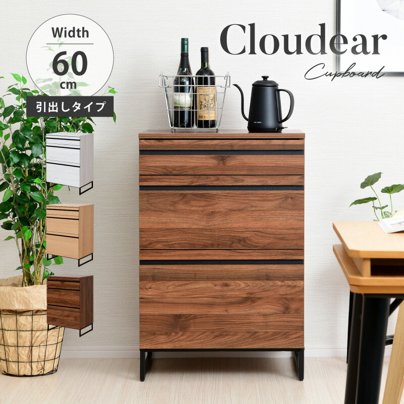 【サイズ】 ◆本体サイズ:幅約60.5×奥行約45×高さ約90.5cm ◆引き出し(上)内寸:幅約51×奥行約38.5×高さ約6(最大11)cm ◆引き出し(カゴ)内寸:幅約47.5(最大51)×奥行約36.5(最大38.5)×高さ約6(最大8.5)cm ◆引き出し(中)内寸:幅約51×奥行約38.5×高さ約12.5(最大16)cm ◆引き出し(下)内寸:幅約51×奥行約38.5×高さ約13(最大30)cm 【耐荷重】 ◆天板:30kg ◆引き出し(上):5kg ◆引き出し(カゴ):3kg ◆引き出し(中):7kg ◆引き出し(下):10kg 【材質】 ◆天板:合成樹脂化粧合板(PVC) ◆本体:プリント紙化粧合板 ◆脚:鉄 【梱包数】 ◆1 【備考】 ◆お客様組立品です。プラスドライバーをご用意ください。 ◆実際の商品の色にできるだけ近づけるよう撮影を行っておりますが、 お使いのモニターによって明るさや色が多少異なって見える場合がございます。 ◆配送料金は地域により異なる場合があります。 別途追加送料が発生する場合、注文確認後、当店よりメールにてご連絡いたします。 ◆商品の仕様は予告なく変更になる場合があります。 ◆本商品は当店オリジナル商品です。 キッチンキャビネット カテゴリはこちら 【関連ワード】 moca company クラウディア ミニ食器棚 ミニキッチンボード ミニカップボード 食器棚 大型レンジ対応 ブラウン ナチュラル ウォールナット キッチンボード アイアン レンジ台 キッチン収納棚 キッチンラック カップボード カウンター 食器棚 大容量 脚付き 食器棚 ラック 60cm 幅60cm キッチンストッカー キッチン収納 ホワイト ブラウン>>Cloudearシリーズ全商品一覧はこちら