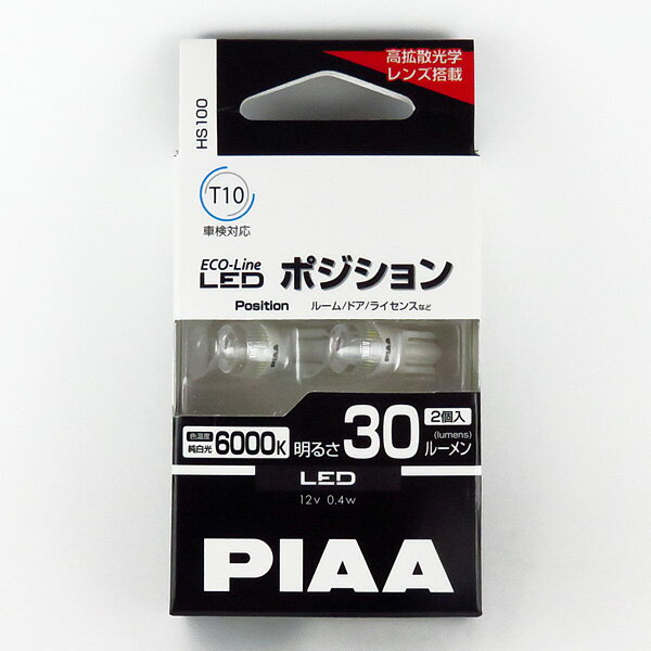 ECO-Line LED ポジション●高拡散光学レンズ搭載●ルーム/ドア/ライセンスプレートなどに●車検対応【仕様】形状:T10色温度:6000ケルビン明るさ:30ルーメン定格:12V 0.4W入数:2個メーカー:PIAA/ピア品番:HS100メール便対応商品です。◆追跡サービス◆ 差し出しからお届けまでの配送状況をご確認頂けます。◆配達方法◆ お届け先の郵便受けに配達致します。◆配達日◆ 日曜・休日も含めて毎日配達いたします。◆お届けまでの日数◆ おおむね出荷日の翌日?翌々日にお届け致します。 但し、お届け先が遠方の場合や離島などの一部地域の場合など、さらに数日要する場合が御座います。 お急ぎの場合は宅配便をご利用下さい。※注意事項※■郵便受けに配達されるため代金引換はご利用頂けません。■翌日配送サービスには対応しておりません。また、配達日時指定も出来ません。■メール便対応商品を複数ご購入頂いた場合や、メール便対応外商品と同梱での発送の場合、 宅配便で発送する場合が御座いますので、予めご了承下さい。※メール便の場合の返品交換について※■配達中の商品破損、紛失があった場合でも保証、交換等は対応致しかねます。 万が一、ご購入商品と違った商品が届いた場合には交換対応させて頂きます。【エコラインLED ラインナップ】品番タイプケルビンルーメン仕様入数HS100T106000K30lm12V 0.4W2HS101T106500K30lm12V 0.4W2HS102T106000K60lm12V 0.8W2HS103T106500K60lm12V 0.8W2HS104T10x31(T8x29)6500K70lm12V 1.2W1HS105T10x31(T8x29)6500K100lm12V 1.4W1HS106T166500K160lm12V 1.8W1HS107T20シングル6500K310lm12V 3.4W1HS108T20シングルオレンジ100lm12V 3.4W1HS109S25シングルオレンジ100lm12V 3.4W1HS110LED専用抵抗--12V 6Ω2