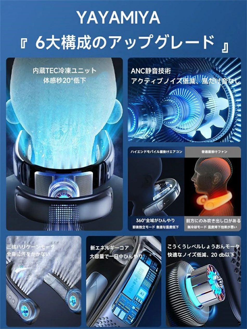 ネッククーラーが、バッテリー持続時間の大革新を達成しました!4000mAhの新たにアップグレードされたバッテリーにより、FanモードのEco段階では28時間連続で冷たさを保ち、冷却モードのMax段階では最大3時間使用可能です。さらにわずか30分で50%まで充電可能です。いつでも快適なクールダウンをお楽しみいただけます!【爆発的な冷却能力!いつでも最高!】高効率なデュアル半導体冷却プレート設計を採用し、パワフルで瞬時に冷たく、数秒で体感温度を16°Cも下げることができます。また、HyperVortexエアフロー技術を採用し、顔と首をよりよく冷やし、爽やかな冷風を広く伝えます。この先進的なNTCスマート温度制御技術により、一定の温度で冷たさを提供し続け、いつでも炎天下から逃れることができます。COOL首掛け扇風機を身に着ければ、いつでも最高のパフォーマンスを発揮でき、屋外活動をより楽しいものにします。【スマートAI、自由なカスタマイズが可能!】スマートアプリを使って、ネッククーラーを制御してパーソナライズすることができ、あなたのライフスタイルに合わせてねっくくーらーを調整できます。スムーズで自然な風速調節機能を備えた無段階調節技術により、タイマー、あるいは自分の気分に合わせて新しいモードを作成することができます。あなたのスタイルに合わせたCOOLをお楽しみください!【快適にフィットするネックバンドをあなたに!】あなたの首元をいつでも涼しく快適に保つ、柔らかく肌触りの良いメモリーシリコンが最高にフィットします。YAYAMIYAはあなたの首にぴったりフィットし、日常生活から激しい運動まで、快適な密着感を提供します。軽く、静かで、髪の毛に絡まることもありません。このおしゃれなネックファンがあれば、あなたは暑い日でも自由自在に快適に過ごせます。【細部にこだわることが品質を物語る生涯サポート】スマートウェアラブルエアコン x1、USB-C充電ケーブル x1が含まれたパッケージです。父の日のプレゼント、母親、女性、男性、恋人、友達、家族など、あらゆる方にぴったりの夏の特別なギフトで、迷うことはありません!