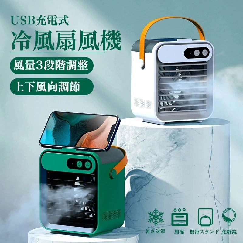【商品説明】送風?冷却?加湿?多機能を同時に備え卓上冷風機で、扇風機よりずっと涼しくて、エアコンほど寒くならないので日中でも快適に利用できます。?【商品仕様】?商品名:ミニ水冷エアコン?カラー:ホワイト、グリーン?素材:ABS?サイズ:133*111*158mm?タンク容量:150ml?電池容量:2400mAh?使用時間:3-6時間?重さ:約400g?消費電力:3w?セットの内容:本体*1、ケーブル*1、説明書*1?【3段階風量調節可能】卓上冷風機の風量は好みに合わせて弱?中?強の3段階に設定可能。使用時はお好みに合わせて自由に風量を調節できます。風量切替スイッチをクリックするごとに簡単に切り替えます。?【様々な使い方】送風:普通の扇風機として使えます。加湿:水タンクに水を注いたら、ミスト機能を起動すると霧風が吹き出します。冷却:水の中に、氷水を入れれば、さらに冷やされた霧風が吹き出し、もっと涼しく快適に!。?【静音作業】本冷風扇は静音モーターを使用し、1段階の作動音は20db以下で、睡眠や読書、仕事に邪魔にならなくご使用いただけます。?【送風口調節可】上下に調節できる送風口、お好みの角度に調整し、より広く風を吹き出します。全方位の角度から気持ち良い涼しい風が吹きます。暑い夏で涼しい風をお楽しみます。?【超軽量&持ち転び便利】約400gの超軽量小型扇風機、ハンドルも付き、オフィス、読書コーナー、寮、家庭、仕事部屋、地下室などどこへでも持ち運びに便利です。お友達やご家族へのプレゼントとしても最適です。?【USB充電式&2400mAh電池内蔵】冷風扇は便利なUSB充電式を採用して、面倒な電池交換は不要です!2400mAhのバッテリを内蔵し、フル充電には約3-6時間連続使用できます。(運転モードより使用時間が違います。)?【安心な品質保証】製品に関するご質問がある場合は、いつでもお気軽にお問い合わせください。顧客の問い合わせ内容に基づいて無料再送、又は返金対応致します。お客様が満足できるよう、誠心誠意対応させていただきます。?【関連キーワード】冷風扇 冷風扇風機 冷風機 強力 人気 静音 小型 卓上 超音波 水冷エアコン 卓上扇風機 卓上冷風機 スポットクーラー 携帯扇風機 ポータブルエアコン 冷却加湿 卓上クーラー ミニクーラー 小型クーラー ポータブルクーラー 送風機 3段階風量調節 USB給電 一台三役 送風 加湿 冷却 ハンドル付き 持ち運び 省エネ 軽量 強力 強風 コンパクト 低騒音 熱中症 暑さ対策 冷却機能 空気清浄 タイマー機能 LCDスクリーン表示 LEDライト オフィス 車用 車中泊 個室 台所 野外のテント 寝室 居間 自宅用