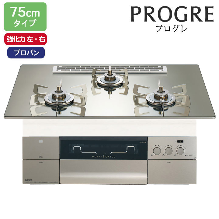 【N3WV7RWTP2SI】ノーリツ ビルトインコンロ Fami(ファミ) スタンダード 75cm幅/プロパン ムーンシルバー NORITZ ※品番にて注文をさせていただきます。メーカーにて品番の確認をお願いいたします。画像はイメージです。 スッキリデザインにリニューアル。 ●調理性能/ダブル高火力&ダブルトロ火、炊飯機能、湯わかし機能、温度キープ、無水両面焼 ●お手入れ/つやめきガラストップ、ラックリングごとく、洗えるサイドカバー、排気口落下物ガード ●安心性能/Si基準、焦げつき自動消火機能、グリル過熱防止センサー、グリル防炎機能 ●フラットエッジ ガラス面との段差をより少なくしたフラット形状で、キッチン全体の印象をよりシンプルに。シャープな印象で上質感を演出します。 ●ラックリングごとく バーナーリングとごとくが一体化。セラミックコーティングを施したバーナーキャップとの組み合わせでお手入れ性を追求しました。