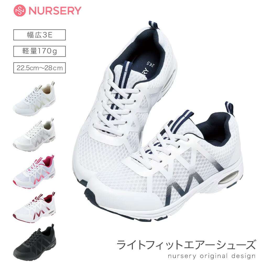 おすすめカテゴリ (v83_2308)ナースリーで叶える!私にちょうどいい幅広5Eエアーシューズ様々な好みやサイズがあるから、ナースリーではついに「幅広5E」を新定番2 Wayデイリーエアーシューズで作りました!・幅広5E・サボにもなる2Way仕様・軽くて足・腰にやさしいエアー入りソール・さわやかで靴下が滑りにくい凸凹インソール・凸凹インソールのかかと部にクッション性あり・軽量約150g(片足23.5cm)【MDおすすめポイント】ゆったり履けるよう従来よりも履き口を広げ、つまずきにくくするため爪先部分も約3mm上げました。 素材 アッパー:合成皮革・ナイロンメッシュ底材:EVA・ラバー 重量 約150g(片足23.5cm) ヒール高 約4cm タイプ 5E インソール取りはずし 可 ○凹凸インソール ○エアー入りソール ○ヒールカップ ○2WAY ○軽量 ○幅広 3Eタイプはこちら 新定番2Wayデイリーエアーシューズ ≫ 【着用イメージ】 【ポイント】 つま先3mm上げ 履き口広め 幅広5E サボにもなる2Way仕様 軽くて足・腰にやさしいエアー入りソール さわやかで靴下が滑りにくい凸凹インソール。かかと部にクッション性あり 靴裏(ホワイト×ネイビー) 靴裏(オールブラック) 【カラー】