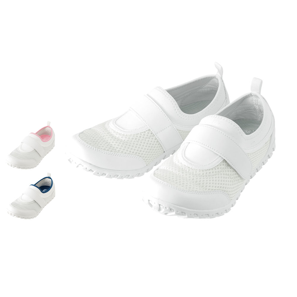 おすすめカテゴリ (v86_2404)デザインメッシュでムレにくく快適! 履きやすくてフィット感のあるジッパー付きシューズ うれしい!ありそうでなかった! ジッパー付きで履き口を広げやすくなったエアー入りナースシューズ。 ・ジッパー付で履き口ぱかっ! ・結び目のない平ゴム仕様 ・内側ジッパーで物に引っ掛かりにくい ・デザインメッシュでムレにくく快適! ・デザインテープで余分なところに触れずにぐっとフィット ・程よいかたさのメッシュインソールで快適 ・軽量約195g(片足23.5cm) 【着用イメージ】【ポイント】ジッパー付で履き口ぱかっ!結び目のない平ゴム仕様内側ジッパーで物に引っ掛かりにくいデザインメッシュでムレにくく快適!デザインテープで余分なところに触れずにぐっとフィット程よい弾力のインソールで快適靴裏(ペールピンク)【カラー】 【仕様】 ●素材/アッパー:ナイロンメッシュ・合成皮革、底材:EVA・ラバー ●重量/約195g(片足23.5cm)●ヒール高/約4.5cm●タイプ/3E ●インソール取りはずし/可○軽量○内側ジッパー付 ○エア入りシューズ○平ゴム仕様