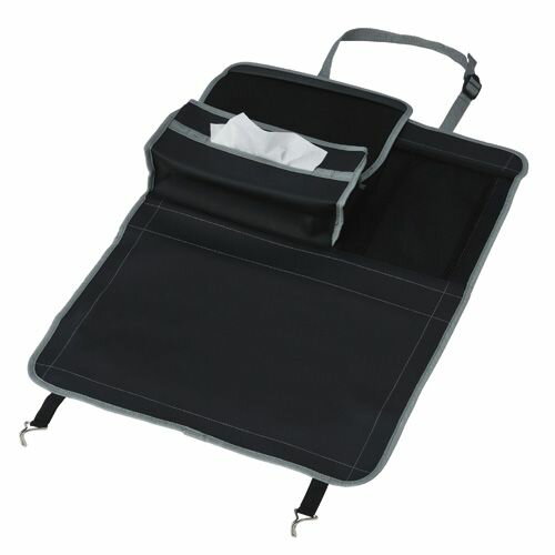 前席背面をお子様からの蹴り汚れからガードします ●汚れても拭き取りやすい素材を使用しています。 ●便利なティッシュBOXケース付きです。 ●邪魔にならないマチ付きメッシュポケットをサイズ違いで3つ備えています。 ●取り付けベルトでアジャスター付きなので、お好みの位置に設定できます。 ●シート下部は金属製フックでシートにしっかり固定可能です。 ●株式会社セイワのキックガードをDCMでは販売しております。その他のドライブ用品も多数取扱っております。