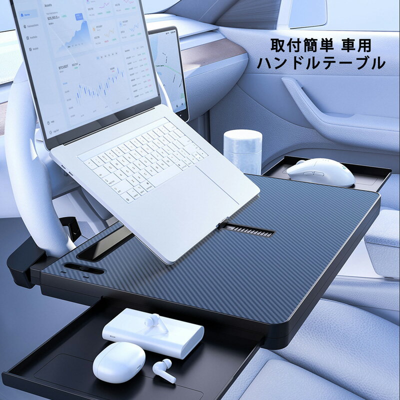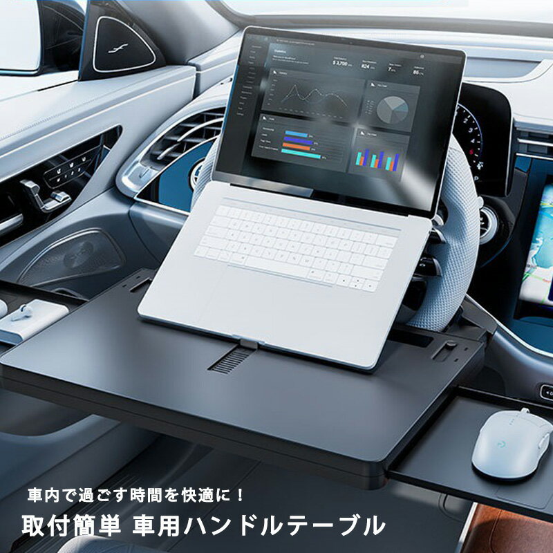 車内がオフィスやカフェに!出先でもスマートに働く「ハンドルテーブル」営業の外回りや長距離運転中に、車内でパソコン作業をしたり、食事を済ませたりしたい時はありませんか?今まで膝の上にノートPCやお弁当などを置いていた方も、このハンドルテーブルがあれば、あなたの車が瞬時に快適なオフィスやカフェに早変わり!\こんなシーンで活躍/出先でのオンラインMTG 駐車スペースに車を停めて、ハンドルにテーブルを装着すれば、すぐにミーティングに参加できます。 安定したテーブルの上でPCやタブレットを操作でき、スムーズな商談や打ち合わせをサポートします。空き時間の有効活用 メールの返信、企画書の作成、市場調査など、時間を有効活用して効率よく仕事を進めることができます。ランチタイムの食事 ハンドルにテーブルを固定すれば、食べ物をこぼす心配なく、ゆっくりと食事を楽しめます。 もし水をこぼしたり、汚れてもサッと拭くだけでOK!<商品特徴>取り付けカンタン ハンドルに引っ掛けるだけのシンプル設計。 誰でも簡単に装着できます。スリムに収納 使わない時は、シートとコンソールボックスの間にすっきりと収納できます。 収納ボックスとしても活用でき、小物などの整理に便利です。丈夫な素材 ABS樹脂製で、PCやタブレットを置いてもしっかり安定。 販売バリエーション 1個 サイズ 370×277×55mm 重量 約650g 材質 ABS樹脂 ご注意 ・海外製品の為、縫製方法が国内生産品と異なり、つくりが甘い部分がある場合がございます。・モニター環境によって画像の色が実物と異なる場合がございます。予めご了承ください。・お使いの車種によって取り付けが出来ない場合がございます。 関連ワード パソコン タブレット iPad 食事 車用 デスク PC ノートPC ノートパソコン 車内 運転席 社用車 営業車 営業 出張 車用便利グッズ カー用品 収納付き 作業台 取付簡単 取り外し簡単 ドリンクホルダー お弁当 ランチ ごはん リモート会議 WEB会議 オンライン会議 WEBミーティング オンラインミーティング MTG mtg ZOOM facetime 動画 作業 長距離運転 ドライバー 旅行 ドライブ