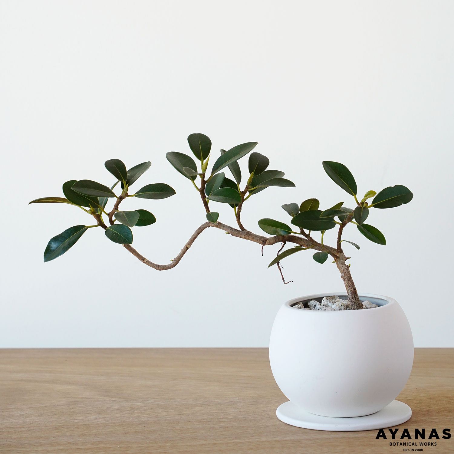 フランスゴムノキ / Ficus rubiginosa ( フィカス ルビギノーサ ) フランスゴムの曲げ仕立ては、S字、螺旋などがあるんですけれど、個人的にはこう言った暴れた曲げ樹形が好きです。 多種多様な暴れっぷりの中から選りすぐりの一鉢を仕入れてきました。 ????? 家具の上にちょうどいい大きさ。ゴムノキ=日陰にも耐える、イメージですが、フランスゴムはしっかり日光に当てると良いです。半日程度、植物に日光が当たる場所が適所。南の窓辺や屋外に置きましょう。植物を引き立てるシンプルな白い陶器の鉢・受皿。 土の表面は軽石を敷いています。 一点もの販売。写真現品をお届けします。(撮影日2026/2/1) ▼サイズ 株全体 高さ:約25(cm) 植木鉢 直径:13 高さ:11(cm) ▼ギフトオプション ・メッセージーカード(100円) ▼お手入れ 植物に日光が当たる場所が良いです。南の窓辺や屋外が適所。空気が澱まないよう、一日5分でも十分な換気を行ったり、サーキュレーターでそよ風のような流れを作ってあげるのも効果的です。エアコンの乾燥した風は苦手ですので、直接当たらないよう注意しましょう。 土の表面に敷いてる軽石を退けてみて、土がサラサラに乾いていたらたっぷりと水やり。毎日与える必要はありません。 ▼アフターフォロー はじめての方にも安心して育てていただけるよう「 育て方メモ 」を同封しています。 育て方に迷ったらLINE「 みどりいろの窓口 」でお気軽にご連絡ください。 ▼観葉植物の育て方・基本的な5つのポイント 1、植物に日光が当たる場所に置く。 2、風通しのいい場所に置く。 3、温暖な場所に置く。(酷暑・厳寒に注意) 4、霧吹きで葉水を与える。(加湿、害虫予防) 5、水やりは土の表面が乾いたら、底穴から流れるくらいたっぷり。 【 お願いしていること 】 実店舗、自社サイトでも同時販売しています。 在庫数更新の遅れにより、ご注文のタイミングによって欠品している場合があります。 予めご了承ください。