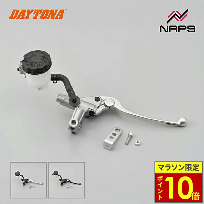 ABOUT NAPS -ナップスについて- 「For all Riders.」豊かなオートバイライフを過ごすために私たちは全力でサポートします。 ナップスは、1962年創業のオートバイ用品の小売・開発を行っています。 「ヒトのナップス」をコンセプトに、高い現場力と商品の品揃えの豊富さを特徴とし、多様化するオートバイユーザーのニーズやファッションのトレンドを追い続けています。 【実店舗について】 国内、海外合わせて32拠点(アップガレージライダース6店舗含む)で展開する、日本最大級のオートバイ用品店です。 販売はもちろん、メンテナンス・サイズ調整・フィッティング等のアフターサービスも行っております。 神奈川県7店舗・東京都6店舗・埼玉県2店舗・群馬県2店舗・宮城県1店舗・静岡県1店舗・愛知県4店舗・大阪府2店舗・京都府1店舗・岡山県1店舗・広島県2店舗・愛媛県1店舗・福岡県1店舗・台湾1店舗 タンクステー、ブレーキスイッチも付属した安心のボルトオン設計。●本体:シルバー / レバー:バフクリアー●本体:ブラック / レバー:バフクリアー●本体:ブラック / レバー:ブラック・ピストン径:1/2インチ (約12.7mm) ・カラー:タンク - ホワイト・レバータイプ:標準・Φ22.2ハンドル用・レバーアジャスト6段階調整可能・ブレーキスイッチ (平端子2極タイプ) / アルミタンクステー×1 / ミラーホルダー (M10×P1.25正ネジ) ×1 付属・リザーバータンクホース長:70mm・バンジョーボルト (M10×P1.25) 別売り【注意備考】※ブレーキホースの取出方向・角度がノーマルとは異なります。※ガスケットは必ず新品に交換してください。ダブルバンジョーで3枚、シングルバンジョーで2枚は必要です。※ご使用のキャリパーとの組み合わせによっては必要ブレーキ液圧が発生する前にレバーがグリップに当たり使用できないレバーアジャスター位置があります。レバーアジャスターの調整を行ない、ブレーキが十分に効き、なおかつレバーがグリップに接触しないレバーアジャスター位置でご使用ください。調整しきれない場合は別売りの4段調整レバー (バフクリアー/23319) または (ブラック/27354) をご使用ください。※シリコン系DOT5 (BF5) ブレーキフルードは使用しないでください。※ABS付車両は、ABS機能が正常に作動しない場合があるため、取り付けできません。※RC30タイプのレバーを使用するとシリンダーが押されたままの状態になり、ベーパーロック等の原因となりますので指定レバー以外は絶対に使用しないでください。