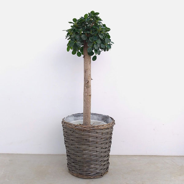 初売りセール 観葉植物 インテリアグリーン 多幸の木観葉植物/[送料無料]パンダガジュマル 8号鉢植え 幹細め 高さ約90cm VA8バスケット入り肉厚で光沢のある丸い葉を茂らせるパンダガジュマルの接ぎ木株です。一般的なガジュマルはやや細く先端がとがった葉ですが、パンダガジュマルは丸くかわいらしい葉です。また、パンダガジュマルは実生苗だと幹が細く葉が落ちやすいので栽培難易度が高いのですが、この株は強健な普通のガジュマルに接ぎ木してあるので、安心して管理していただけます。台木の大きさや接ぎ木部の形状、枝ぶりなどに個体差があります。写真はお届けする株の一例ですが、若干異なるものとなりますのでご了承ください。沖縄ではガジュマルの古い巨木にはキジムナーという名の精霊が住むという言い伝えがあります。キジムナーは体長1m位で真っ赤な髪の毛のいたずら好きですが、家に住み着くとその家が栄え多くの幸福をもたらすとも言い伝えられています。※写真はイメージです。時期により葉のボリュームが異なります。鉢下からの全体の高さ:約90cm鉢サイズ:高さ26cm×直径25cm×鉢底径15cmタイプ:クワ科の常緑性高木原産地:東南アジアから沖縄、インド耐寒温度:0℃以上栽培方法:耐陰性はありますが、きれいな葉をつけるには、明るい場所での管理をおすすめ致します。5〜10月は生育期のため土が乾いたら水をたっぷり与えます。また、この期間は2ヶ月に1度観葉植物用の置き肥を根元に施してください。やや湿度を好む植物ですが、冬は室内で管理し、水遣りも控えめにしてください。直径28cm、高さ29cmのバスケット入りです。■お届け地域について ・北海道、沖縄、離島へのお届けは、追加送料(実費)をいただきます。 ※写真はイメージです。時期により葉のボリュームが異なります。[送料無料]パンダガジュマル 8号鉢植え 幹細め 高さ約90cm VA8バスケット入りの栽培ガイド観葉植物の管理方法インテリアにおすすめの、縁起の良い観葉植物