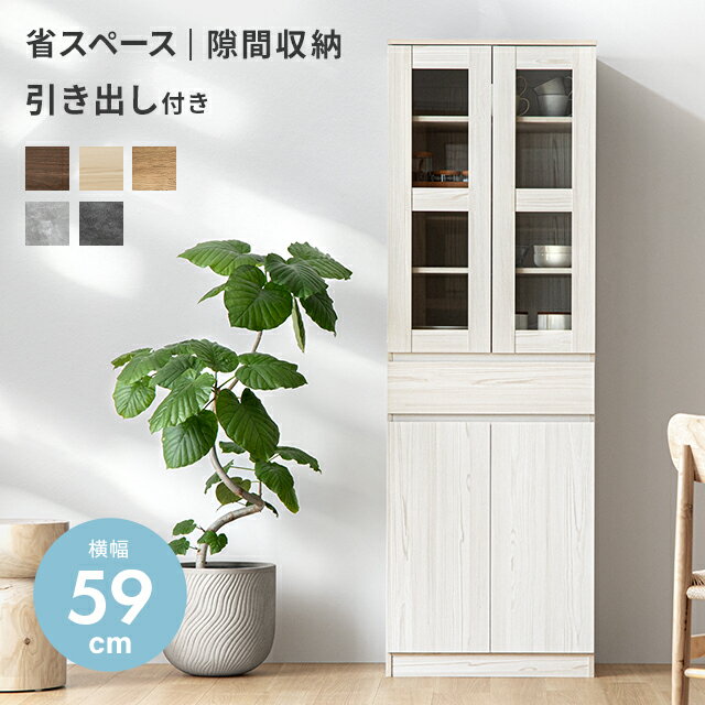 サイズ(約) 幅590×奥行き398×高さ1800mm 材質 パーティクルボード、MDF 重量(約) 47kg 耐荷重(約) 天板:16kg 上段扉内棚板:13.5kg 下段扉内棚板:13.5kg 引き出し:3kg 製品保証 3ヵ月間保証 組み立てについて 組み立てには以下の工具が必要となります ・ドライバーセット ・プラスチックハンマー ご購入前の注意事項 ・モニターにより実際の色と異なる場合がございます ・デザインや仕様は予告なく変更する場合がございます 送料 無料 沖縄・離島:お見積り 開梱設置サービス 追加料金:18,820円 ご希望の方はご購入時に選択メニューよりお選びください 開梱設置サービスについて 追加料金 ・別途送料がかかる地域の方 ご注文時には追加料金が反映されません 「ご注文確定メール」にて改めてご案内いたします 配送 ・出荷後のキャンセルや変更は別途送料が発生します 商品情報 スッキリ収納を叶えるキッチンボード 扉付きで清潔感をキープできるキッチンボード。日常の食器はガラス扉でサッと取り出し、鍋などは観音開き扉ですっきり隠せます。可動棚で収納空間を自由にカスタマイズでき、見た目も使い勝手も満足できるキッチン収納が完成します。 単体でも組み合わせでもカスタム自在 コンパクトなキッチンに置きたい方も広いキッチンに充実収納を備えたい方もシーンに合わせて自由に拡張できるデザインです。 空間にフィットするスリム設計 キッチンの狭いスペースにも置けるスリム設計。ムダのないサイズ感でたっぷり収納を実現。 サッと取り出せるガラス扉収納 中身が一目で分かるガラス扉収納で、毎日使う食器や調味料をサッと取り出せます。見た目も美しく、キッチン全体に開放感をプラス。使い勝手とデザイン性を両立した収納スペースです。 すっきり隠せる観音開き扉収納 観音開き扉収納で、鍋やフライパン、調理家電などの生活感が出るアイテムをすっきりと隠せます。使わない時はしっかり収納し、キッチン全体を整った美しい空間に保ちます。 高さ調節可能な可動棚 扉収納には全て可動式の棚板を採用。3.2cmごとに高さを調節でき、棚板を外せば高さのあるものも収納可能。収納スペースの自由度が広がり、様々なアイテムを美しく整理できます。 使い勝手の良い引き出し収納 カトラリーや調理器具、小物類をすっきりと整理整頓。取り出しやすく見た目も美しく保てるため、キッチン作業がスムーズに。細かなアイテムも迷わず収納でき、快適な空間を実現します。 安心して使える耐荷重 食器や調味料、キッチン家電など様々なアイテムをたくさん収納しても安心の耐荷重設計。重さを気にせず、収納スペースを活用できるため、キッチンをより快適で整った空間に保てます。 壁に固定できる転倒防止ベルト付き ご使用いただくことで地震等の対策にもなり、より安定性を強化できます。 ネジ穴のカバーシール付属 シールが付属しており、貼るだけでネジ穴を目立たせず隠すことができます。