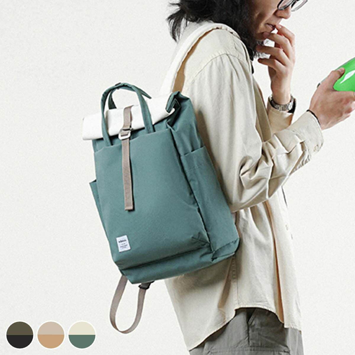 サイズ約 幅27×奥行19×高さ46(cm)重量約 530g容量約 11L内容量1個材質リサイクルポリエステル100%種類CAPULETOLIVE×FLATBLACK、FOGKHAKI×CARAMEL、PALEYELLOW×SEABLUE生産国中国製耐荷重約 6kg区分返品・キャンセル区分(小型商品)ギフトラッピングページを見る【25年FW】リュック hellolulu ケーシー KACYおすすめポイント毎日使えるショルダーバッグシンプルな見た目ながらも機能性が充実したバックパックです。バイカラーの個性的なデザインで、ユニセックスで使えるアイテムです。デイリー使いからハイキングや小旅行まで幅広く使えます。荷物に合わせて容量を変えられる拡張して使えるロールトップ仕様で、荷物の量に合わせてバッグのサイズを調整できます。外出先で急に荷物が増えても簡単に拡張できます。小旅行にも使える抜群の収納力奥行14cmとしっかりとしたマチがあり、いつもの荷物に水筒、ポーチ、8インチのタブレットも入る見た目以上の収納力です。計7個のポケットが付いており、お子様とのお出かけや荷物が多い時にも大活躍します。商品詳細雨の日も安心な撥水加工撥水加工が施されているので、急な雨でも安心です。リサイクルしたポリエステル素材を使用しており、軽量で使いやすいだけでなく環境にもやさしいアイテムです。出し入れしやすい、マグネット開閉式メイン収納はマグネット開閉式です。最大14インチのPCを収納できるパッドが入った仕切りに、小物収納に便利な内ポケットが2個付いた充実収納。散らかりがちなバッグの中身もすっきり整理整頓できます。小物収納に便利な前面ポケット前側には、B5サイズがすっぽり収まる大きめのポケットが付いています。さらにそのポケットの中にはファスナー付きのポケットもあるので、小物を分けて入れるのに便利です。紛失防止のキークリップ付き前面ポケットの中のファスナーポケットにはキークリップ付きです。鍵やイヤホンなど引っ掛けておけば、バッグの中で迷子にならずさっと取り出せます。ボトルが収納できるサイドポケット両側面のサイドポケットには、ペットボトルやタンブラー、折り畳み傘などを収納できます。メイン収納につながる背面ファスナー付き背面にはメイン収納につながるファスナーがあり、奥の荷物も上から開けずに取り出せます。背面ファスナーを開けたすぐ横にはファスナー付きの隠しポケットが付いており、大切な貴重品をしっかりと守ることができます。荷物を守る、安心仕様持ち手はボタンでまとめられ、スムーズに持ち運べます。また、持ち手下には開口部と外ポケットを閉じるフックベルトが付いているので、電車や人混みの中でも安心して使えます。耐久性の高いバックルショルダーストラップは長さ調節が可能です。樹脂製のパーツには、機能的で耐久性の高いUTX Duraflexを採用しています。商品画像カラーサイズブランド紹介hellolulu(ハロルル)は、2005年に香港で生まれたバッグブランドです。「シンプルで、楽しく、使いやすい」バッグで持つ人を楽しくさせたいというコンセプトは『Carry Happiness』というブランドメッセージにも表現されています。使う人たち一人一人の個性をより際立たせながらも、楽しくクリエイティビティにあふれた生活へと導いてくれる、そんな予感を期待させるブランドです。シリーズ紹介KACY/MACO関連キーワード:手提げ カバン デイパック サイド 背面 ポケット PC ノートパソコン 14インチ 女性 女子 男性 男子 ユニセックス 男女兼用 オシャレ お洒落 シンプル 軽量 エコ リサイクルポリエステル UTX Duraflex バックル 調整可能 おすすめ 人気 オススメ 実用的 機能的 使いやすい 日常 普段使い プレゼント 贈り物 ギフト ブランド 香港 耐久性 外ポケット 内ポケット フロントポケット ファスナー ジッパー キークリップ 買物 買い物 お出かけ フェス 旅行 ショッピング アウトドア 国内旅行 日帰り旅行 機内持ち込み 出張 大容量 大学 講義 高校生 中学生 授業 バイカラー ベージュ ブラウン カーキ ブラック 黒 ブルー 青 緑 グリーン LH18538 LH14260 関連商品はこちら リュック hellolulu ケーシー KA13,200円リュックサック hellolulu KACY 13,200円? リュック hellolulu マコ MACO15,400円リュック hellolulu カーター CAR12,100円リュック Hellolulu CELESTE 9,900円リュック Hellolulu KELL new24,200円リュック Hellolulu KELL 3WA19,800円リュック hellolulu CELESTE 9,900円?リュック Hellolulu NASH デイリ15,400円リュック Hellolulu TULLY 1112,100円リュック Hellolulu SARO 15L15,400円 リュック hellolulu ローリー RO14,960円