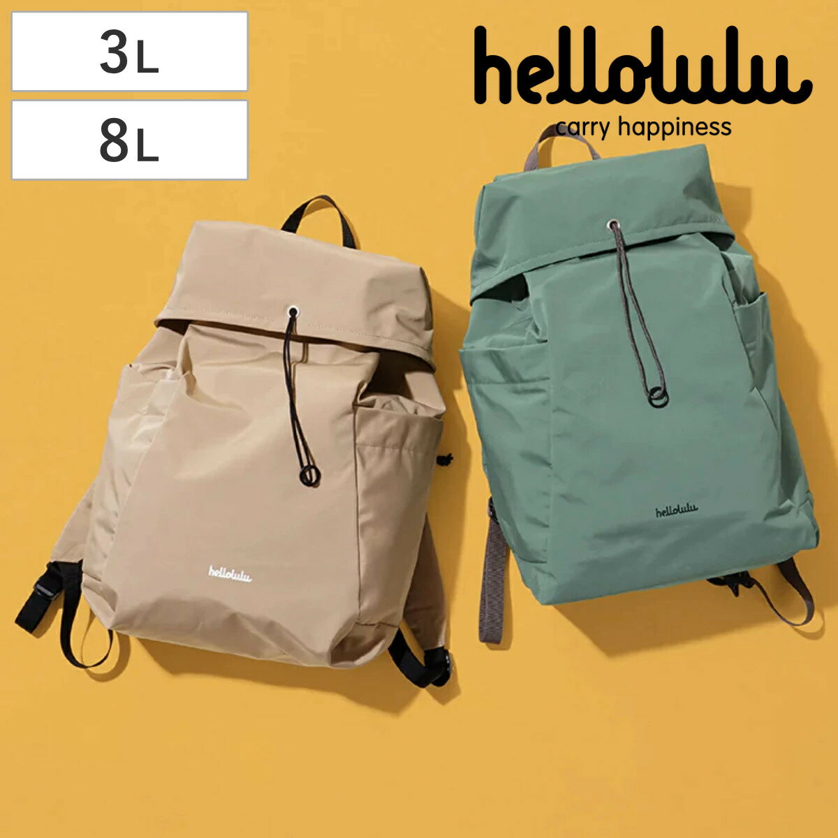 サイズ【CELESTE(3L)】約 幅21×奥行11×高さ29(cm)【JESSE(8L)】約 幅27×奥行12×高さ40(cm)重量【CELESTE(3L)】約 290g【JESSE(8L)】約 390g内容量1個材質メイン生地:PETポリエステル100%裏地:PETポリエステル100%カラーSoulBlack、MellowBuff、RoseCloud、OldBlue、PureGray、LavaGray生産国中国製耐荷重【CELESTE(3L)】約 3kg【JESSE(8L)】約 6kg区分返品・キャンセル区分(小型商品)ギフトラッピングページを見るリュック hellolulu CELESTE JESSE 3L 8Lおすすめポイント荷物の出し入れがしやすい巾着式バックパック大きく開いて出し入れしやすい、開閉口が巾着式のドローストリングバックパック。「CELESTE(3L)」は必要なものをさっと入れて出かけられるコンパクトサイズ、「JESSE(8L)」はA4ファイルや雑誌までしっかり入るサイズです。通勤・通学にはもちろん、街歩きやショッピング、旅行など幅広いシーンで活躍します。雨の日でも安心な撥水加工撥水加工が施されているので、急な雨でも安心です。リサイクルしたポリエステル素材を使用しており、軽量で使いやすいだけでなく環境にもやさしいアイテムです。商品詳細機能が充実したメイン収納内側にはノートPCやタブレット用のパッド付きの仕切りが付いており、書類や雑誌、ノートなどもすっきり収納できます。小物収納に便利なファスナーポケットの他、バッグの中で紛失しがちな鍵やイヤホンなどを引っ掛けられるキークリップ付きです。※「CELESTE(3L)」は11インチのiPad Pro、「JESSE(8L)」は14インチまでのノートPCに対応※ライニング(裏地)の色仕様の変更がございます。詳しくはページ下部のご注意点をご確認ください。両サイドにポケット付き両サイドには、ペットボトルや水筒、折り畳み傘などが収納できるポケットが付いています。「CELESTE(3L)」は片側、「JESSE(8L)」は両側がスナップボタン仕様で、広がりにくくスマートなスタイルを保てます。背面にファスナーポケット背面には背負いながらでも出し入れしやすいファスナーポケットが付いています。携帯や財布などよく手に取る物を入れておけば、すぐに取り出せて便利です。調節可能なショルダーストラップショルダーストラップはお好みの長さに調節可能です。樹脂製のバックルには、機能的で耐久性の高いUTX Duraflexを採用しています。商品画像カラーサイズご注意点ライニング(裏地)の色仕様変更について一部商品のライニングが色仕様変更となります。メーカーの生地ロットが終わり次第、順次切り替わりとなりますため、新・旧ライニングはお選びいただけません。予めご了承ください。■本商品ページ 該当カラーパターン 3:SoulBlack/RoseCloud/OldBlueパターン 4:MellowBuff/PureGrayブランド紹介hellolulu(ハロルル)は、2005年に香港で生まれたバッグブランドです。「シンプルで、楽しく、使いやすい」バッグで持つ人を楽しくさせたいというコンセプトは『Carry Happiness』というブランドメッセージにも表現されています。使う人たち一人一人の個性をより際立たせながらも、楽しくクリエイティビティにあふれた生活へと導いてくれる、そんな予感を期待させるブランドです。関連キーワード:カバン バックパック 3l 8l PC ノートパソコン 雑誌 ノート マザーズバッグ ママリュック 女性 女子 男性 男子 ユニセックス 男女兼用 オシャレ お洒落 シンプル 軽量 ポリエステル UTX Duraflex バックル 調整可能 おすすめ 人気 オススメ 使いやすい 日常 普段使い プレゼント 贈り物 ギフト ブランド 香港 耐久性 外ポケット 内ポケット フロントポケット キークリップ 買物 買い物 お出かけ フェス 旅行 ショッピング アウトドア 出張 大容量 大学 講義 高校生 中学生 授業 ピンク ベージュ ブラック 黒 グレー カーキ 緑 series_hellolulu LH14260関連商品はこちらリュック Hellolulu NASH デイリ15,400円ショルダーバッグ hellolulu リース 11,880円hellolulu EILIF 3WAY スリ5,000円マザーズバッグ リュック レディース メンズ 10,560円ポーチ hellolulu DOLCE 3,850円マザーズバッグ リュック レディース スクエア9,460円マザーズバッグ 3WAY H型 マザーズリュッ10,120円ビジネスリュック re:credo シェルフィ9,900円ビジネスリュック CHARMISS Cinti11,000円エコバッグ 手の平サイズに畳めるリュック 2w1,280円ショルダーバッグ OSAMPO はっ水ポリショ4,510円ボストンバッグ 高密度ポリボストン&ショルダー5,390円