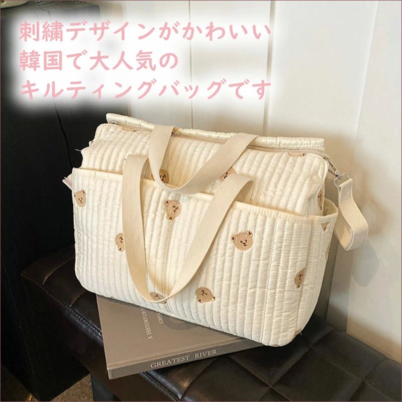 商品内容:マザーズバッグサイズ:本体:約27×46×22cmショルダーストラップ:約49〜88cmサイズは規定値です。採寸方法の違いや個体差によって多少の誤差がございますので、予めご了承ください。素材:綿100%カラー:くま、うさぎ、チューリップ、オリーブ重さ:約330g商品特徴【大容量】 たっぷり入る大容量サイズで荷物が多いママさんも安心。【ポケット付き】 外ポケットはスマホやウエットティッシュなどすぐに取り出したいものを入れるのにとても便利♪内側も5つのポケットで小物の整理整頓もばっちりです。【超軽量】 重さ約330gと軽量で折りたたんでコンパクトにもなるので、持ち運びにもおすすめ。【水洗いOK】 コットン100%素材なので、汚れたらすぐに洗え、いつでも清潔に。洗うたびにふっくらとした生地感に育てて使えます。【3way】 ショルダーストラップ付きなので、手持ち、肩掛け、斜め掛けの3wayで使用可能。