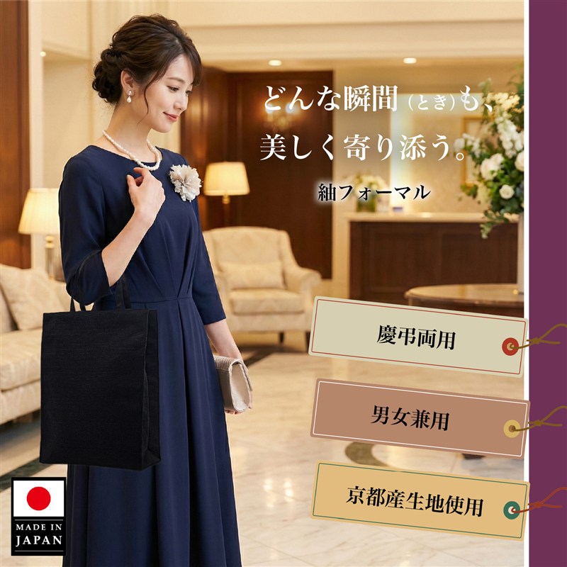 おすすめ商品 商品詳細 商品説明 厳粛な場では、持ち物も「品格」が問われます。このサブバッグは、お受験や学校説明会、お葬式や法事といった、最もTPOが求められるシーンにふさわしく、リボンなどの装飾を一切排した「究極のシンプル」を追求しました。どんなフォーマルウェアと合わせても失礼のない、品格ある「漆黒」の無地デザインが最大の特徴です。生地は京都産の上質なトロマット素材を使用しており、軽量(約94g)ながらしっかりとした印象を与えます。A4サイズの書類や冊子が縦にすっきりと収まるサイズ(約W245×H325mm)で、約6cmのマチ(D60mm)も確保。スリッパやポーチなども収納できやすい設計です。さらに、このサブバッグは柔らかい生地のため、使わない時は小さく折りたたんでメインのフォーマルバッグに忍ばせておくことができます。外出先で書類や記念品などを受け取り、荷物が増えた時だけサッと取り出して使う、といったスマートな使い方が可能です。内側には小物の整理に便利なオープンポケットが2つ付いており、機能性も妥協しません。もちろん、自社の熟練職人が一つひとつ丹精込めて縫製した「日本製」。TPOを選ばない本物のシンプルさを求める方に、自信を持ってお届けする一品です。 品 名 サブバッグ シンプルブラック 開 閉 オープン ポケット オープンポケット×2 素 材 表地:ポリエステル裏地:ナイロン 重 さ 94g 原産国 日本 メーカー希望小売価格はメーカー商品タグに基づいて掲載しています商品説明 厳粛な場では、持ち物も「品格」が問われます。このサブバッグは、お受験や学校説明会、お葬式や法事といった、最もTPOが求められるシーンにふさわしく、リボンなどの装飾を一切排した「究極のシンプル」を追求しました。どんなフォーマルウェアと合わせても失礼のない、品格ある「漆黒」の無地デザインが最大の特徴です。生地は京都産の上質なトロマット素材を使用しており、軽量(約94g)ながらしっかりとした印象を与えます。A4サイズの書類や冊子が縦にすっきりと収まるサイズ(約W245×H325mm)で、約6cmのマチ(D60mm)も確保。スリッパやポーチなども収納できやすい設計です。さらに、このサブバッグは柔らかい生地のため、使わない時は小さく折りたたんでメインのフォーマルバッグに忍ばせておくことができます。外出先で書類や記念品などを受け取り、荷物が増えた時だけサッと取り出して使う、といったスマートな使い方が可能です。内側には小物の整理に便利なオープンポケットが2つ付いており、機能性も妥協しません。もちろん、自社の熟練職人が一つひとつ丹精込めて縫製した「日本製」。TPOを選ばない本物のシンプルさを求める方に、自信を持ってお届けする一品です。 品 名 サブバッグ シンプルブラック 開 閉 オープン ポケット オープンポケット×2 素 材 表地:ポリエステル裏地:ナイロン サイズ 約W245×D60×H325mm 重 さ 94g 原産国 日本 注意事項 当商品は機械による生産過程において、どうしても生地を織る際の糸の継ぎ目や多少のほつれ,多少の汚れ等が生じている場合がございます。品質上の問題ではございませんので、こちらの件をご理解頂いた上でのご注文をお願い申し上げます。 皆様により良い商品をより安くご提供させて頂けますよう、ご注文完了後のキャンセル・及び不良品以外のご返品・交換はお受け致しておりません。 お申し込みの際は、サイズ・カラー等よくご確認の上、ご注文くださいますようお願い申し上げます。