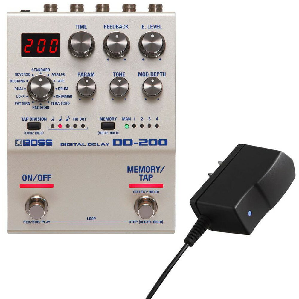 《セット内容》 ・BOSS DD-200 Digital Delay ・BOSS PSA-100S2 ACアダプター 洗練されたボディにシンプルな操作と妥協なき音質を搭載したディレイ BOSSの200シリーズは、ペダルボードへのレイアウトを容易にするコンパクトなサイズ設計で、高品位なサウンドと高い汎用性を備えた次世代のペダルです。シンプルな操作性を実現したコントロール・ノブと多機能フットスイッチにより、直感的かつ簡単にサウンドメイクを行うことができます。また、お気に入りのセッティングを即座に呼び出すことができるメモリー機能も装備。200シリーズはすべてのモデルにおいて、内部演算32bit float(浮動小数点)の高度な演算処理によるクラス最高峰の音質を実現しました。外部フットスイッチやエクスプレッション・ペダル、MIDI接続によるコントロール機能も充実しています。 DD-200 Digital Delay は、フラッグシップ・モデル DD-500からサウンドと機能を継承。合計12種類のディレイ・モードを搭載しました。汎用性の高いクリアなディレイから、温かみのあるアナログ系、表現力豊かなアンビエント系まで、バリエーション豊かなサウンドを網羅しています。さらに、ルーパー機能や、ディレイ音が途切れることなくシームレスにメモリーの切り替えができるキャリーオーバー機能も搭載しています。 Version 1.1 Update:ユーザー・メモリー数の拡張 Version 1.1アップデートにより、200シリーズのフレキシビリティがさらに向上します。内蔵メモリーが強化され、ユーザー・メモリー数が127へと大幅に拡張。保存したメモリーは、ペダル・スイッチから素早くアクセスができ、また外部MIDI機器からプログラム・チェンジによりダイレクトに呼び出すことも可能です。 ●サンプリング・レート96kHz、AD/DA変換32bit、内部演算32bit float(浮動小数点)の高度な演算処理によるクラス最高峰の音質 ●12種類のバリエーション豊かなディレイ・モードを搭載 ●洗練されたパネル・レイアウトにより、簡単かつスピーディーな操作性を実現 ●作成した音色の保存が可能な127のユーザー・メモリー ●フットスイッチ、またはMEMORYボタンから、指定された範囲のメモリーとマニュアル・セッティングを呼び出し可能 ●最大60秒の録音が可能なルーパー機能 ●演奏中の誤操作を防止するパネル・ロック機能 ●エフェクトのON/OFF、タップ・テンポ、メモリー選択、ルーパーの制御など、機能を自由に割り当て可能なフットスイッチ ●外部フットスイッチやエクスプレッション・ペダル、MIDI制御のための充実したコントロール端子 ●MIDI端子(ステレオ・ミニ・タイプ)を搭載(別売BMIDI-5-35ケーブルを使用) ●ファーム・アップデート用のMicro USB端子 ●別売のACアダプターPSA-100S、または単三電池3本による2電源方式を採用 ■12種類のディレイ・モード DD-200はコンパクトな筐体にバリエーション豊かな12種類のディレイ・モードを搭載。透き通るようにクリアなデジタル・ディレイ、温かみのあるアナログ・ディレイ、Roland RE-201 Space EchoやBinson EchoRec2のレトロなディレイ、想像力を掻き立てるリバース・エフェクトやLO-FI、複数のディレイが重なり合うリズミカルなパターン・ディレイ、そしてTERA ECHOやSHIMMER、PAD ECHOといった個性豊かなアンビエント系まで、ディレイ・タイプに不足はありません。 ■直感的に調整が可能なインターフェイス 直感的かつシンプルなサウンドメイクを実現するために、インターフェイスのデザインは合理性を徹底的に追求しました。ディレイの主要なパラメーターは、本体パネルから直接コントロールすることが可能です。PARAMノブには各モードのキャラクターを最大限に引き出すパラメーターが設定されており、イメージしたサウンドへ即座に到達することができます。 ■お気に入りの設定を保存/呼び出し DD-200で緻密にセットアップしたサウンドは、127のユーザー・メモリーに保存することができます。パネル上の設定を反映しているマニュアル・セッティングをあわせると、合計128のサウンドを切替えて演奏することが可能。本体のフットスイッチは、メモリーを順送りに切り替えるだけでなく、切替える範囲選定、メモリー番号を指定してダイレクトに呼び出すなど、プレイヤーのニーズに応じたアクションも設定できます。MIDIによるプログラム・チェンジが送受信可能なため、外部MIDIデバイスとの統合的なコントロールにも最適です。 ■柔軟性の高いリアルタイム・コントロール 本体のフットスイッチは、バイパスやメモリーのスクロール、タップ・テンポ、ルーパーの制御に加え、ホールドやワープ効果など、任意の機能を割り当ててカスタマイズできます。外部コントロールの拡張性も高く、フットスイッチやエクスプレッション・ペダルの増設により、ディレイ・サウンドをさらに自由なコントロールを実現。また、省スペース設計のステレオ・ミニ端子のMIDI入出力を装備。複数の200シリーズのメモリーを同時に切り替えたり、BOSSのEFFECTS SWITCHING SYSTEM ES