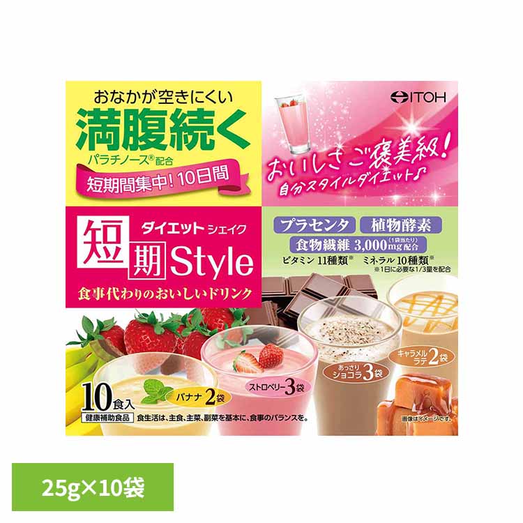 満腹感が続く、食事代わりに飲むダイエットシェイク。定番フレーバー!※リニューアルに伴い、パッケージ・内容等予告なく変更する場合がございます。予めご了承ください。●商品サイズ(cm)幅約15.6×奥行約8.9×高さ約14.1●商品重量約0.315kg●内容量10袋(ストロベリー×3袋、あっさりショコラ×3袋、キャラメルラテ×2袋、バナナ×2袋)●商品区分健康食品●原材料【ストロベリー】パラチノース、大豆たんぱく末、難消化性デキストリン、イチゴ果汁末、マルトデキストリン、コンニャクイモ抽出物、酵母、豚プラセンタエキス、植物発酵エキス、植物油/炭酸Ca、香料、野菜色素、酸化Mg、酸味料、V.C、ソルビタン脂肪酸エステル、甘味料(アスパルテーム・L-フェニルアラニン化合物)、ピロリン酸鉄、V.E、ナイアシン、パントテン酸Ca、V.B1、V.A、V.B6、V.B2、葉酸、V.D、V.B12、(一部に大豆・乳成分・豚肉・小麦を含む)【あっさりショコラ】パラチノース、大豆たんぱく末、難消化性デキストリン、ココアパウダー、コンニャクイモ抽出物、マルトデキストリン、酵母、食塩、豚プラセンタエキス、植物発酵エキス、植物油/炭酸Ca、香料、酸化Mg、V.C、ソルビタン脂肪酸エステル、甘味料(アスパルテーム・L-フェニルアラニン化合物)、ピロリン酸鉄、V.E、ナイアシン、パントテン酸Ca、V.B1、V.A、V.B6、V.B2、葉酸、V.D、V.B12、(一部に大豆・乳成分・豚肉・小麦を含む)【キャラメルラテ】パラチノース、大豆たんぱく末、難消化性デキストリン、インスタントコーヒー、マルトデキストリン、コンニャクイモ抽出物、酵母、豚プラセンタエキス、植物発酵エキス、植物油/炭酸Ca、香料、酸化Mg、クチナシ黄色素、V.C、ソルビタン脂肪酸エステル、甘味料(アスパルテーム・L-フェニルアラニン化合物)、ピロリン酸鉄、V.E、ナイアシン、パントテン酸Ca、V.B1、V.A、V.B6、V.B2、葉酸、V.D、V.B12、(一部に大豆・乳成分・豚肉・小麦を含む)【バナナ】パラチノース、大豆たんぱく末、難消化性デキストリン、マルトデキストリン、バナナ末、コンニャクイモ抽出物、酵母、豚プラセンタエキス、植物発酵エキス、植物油/炭酸Ca、香料、酸化Mg、クチナシ黄色素、酸味料、V.C、ソルビタン脂肪酸エステル、甘味料(アスパルテーム・L-フェニルアラニン化合物)、ピロリン酸鉄、V.E、ナイアシン、パントテン酸Ca、V.B1、V.A、V.B6、V.B2、葉酸、V.D、V.B12、(一部に大豆・バナナ・乳成分・豚肉・小麦を含む)●成分パラチノース 13 g、植物発酵エキス 20 mg、プラセンタエキス 20 mg●原産国:日本●アレルギー物質【ストロベリー 】大豆・乳成分・豚肉・小麦【あっさりショコラ】大豆・乳成分・豚肉・小麦【キャラメルラテ】 大豆・乳成分・豚肉・小麦【バナナ】 大豆・バナナ・乳成分・豚肉・小麦28品目以外は原材料名をご確認ください○広告文責:e-net shop株式会社(03-6706-4521)○メーカー(製造):井藤漢方○区分:日本製・健康食品(検索用:代替食 カロリーコントロール ダイエット シェイク 粉末 分包 パラチノース 4987645492932)最強翌日配送対象商品に関するご案内 最強翌日配送対象商品・対象地域に該当する場合は最強翌日配送マークがご注文カゴ近くに表示されます。 最強翌日配送可能なお支払方法は【クレジットカード、代金引換、全額ポイント支払い】のみとなります。 下記の場合は最強翌日配送対象外となります。 ・15点以上ご購入いただいた場合 ・時間指定がある場合 ・ご注文時備考欄にご記入がある場合 ・決済処理にお時間を頂戴する場合 ・郵便番号や住所に誤りがある場合 ・最強翌日配送対象外の商品とご一緒にご注文いただいた場合 ・お届け先住所文字数が40文字以上の場合