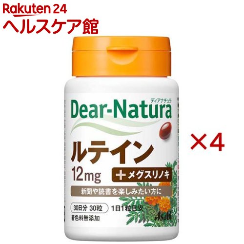 お店TOP>健康食品>サプリメント>カロテノイド>ルテイン>ディアナチュラ ルテイン (30粒入×4セット)【ディアナチュラ ルテインの商品詳細】●いつまでも新聞や読書を楽しみたい方の健康をサポートします。●ルテイン+メグスリノキ配合●ビタミンE配合●香料・着色料・保存料無添加【1日あたりの摂取目安量】1日1粒【召し上がり方】・1日1粒を目安に、水またはお湯とともにお召上がりください。【ディアナチュラ ルテインの原材料】ビタミンE含有植物油(国内製造)、オリーブ油、メグスリノキエキス末/ゼラチン、グリセリン、マリーゴールド、乳化剤【成分】【配合量/1粒(335mg)あたり】ルテイン・・・12mgメグスリノキエキス末・・・20mgビタミンE・・・40mg【栄養成分】1日1粒(335mg)当たりエネルギー:2.2kcal、たんぱく質:0.10g、脂質:0.18g、炭水化物:0.033-0.068g、食塩相当量:0-0.002g、ビタミンE:40.0mg【保存方法】直射日光・高温多湿を避け、常温で保存してください。【注意事項】・1日の摂取目安量を守ってください。・原材料名をご確認の上、食物アレルギーのある方はお召し上がりにならないでください。・妊娠・授乳中の方、乳幼児・小児の使用は避けてください。・治療を受けている方、お薬を服用中の方は、医師にご相談ください。・小児の手の届かないところに置いてください。・体質により身体に合わない場合があります。その場合は使用を中止してください。・保存環境によってはカプセルが付着することがありますが、品質に問題ありません。【原産国】日本【ブランド】Dear-Natura(ディアナチュラ)【発売元、製造元、輸入元又は販売元】アサヒグループ食品※説明文は単品の内容です。商品に関するお電話でのお問合せは、下記までお願いいたします。菓子、食品、健康食品、医薬品・指定医薬部外品、サプリメント、スキンケアなど:0120-630611ミルク、ベビーフード、乳幼児用品専用:0120-889283リニューアルに伴い、パッケージ・内容等予告なく変更する場合がございます。予めご了承ください。(Dear-Natura with ウィズ メグスリノキ)・単品JAN:4946842635474アサヒグループ食品130-8602 東京都墨田区吾妻橋1-23-1 アサヒグループ本社ビル ※お問合せ番号は商品詳細参照広告文責:楽天グループ株式会社電話:050-5577-5042[野菜・果実 サプリメント/ブランド:Dear-Natura(ディアナチュラ)/]