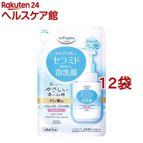 お店TOP>化粧品>クレンジング・洗顔>洗顔>泡洗顔料>ソフティモ 泡洗顔 セラミド つめかえ (130ml*12袋セット)商品区分:化粧品【ソフティモ 泡洗顔 セラミド つめかえの商品詳細】●ふわとろ、やわらか泡が、汚れをすっきりと落とし、しっとり肌に洗い上げます。●泡で出てくるタイプ。●うるおいを保つ機能のセラミド類似成分※・アミノ酸※を配合。※保湿成分●つめかえ用。【販売名】 ソフティモ 泡洗顔CE【使用方法】・ポンプを押すと泡になって出てきます。・手のひらに適量(ポンプ3回押し程度)をとり、やさしく洗顔し、そのあと充分にすすいでください。【成分】水・DPG・ココイルグリシンK・ソルビトール・ヤシ脂肪酸K・ラウリルベタイン・コカミドプロピルベタイン・グリセリン・セリン・BG・EDTA-2Na・EDTA-3Na・PEG-3コカミド・(メタクリル酸グリセリルアミドエチル/メタクリル酸ステアリル)コポリマー・塩化Na・炭酸水素Na・フェノキシエタノール【注意事項】・容器の中に、水が入らないようご注意ください。・直接水がかかる状態でポンプを押さないでください。・容器を振ったり、傾けた状態で使用すると泡にならない、またはポンプが押せなくなります。・高温・低温の場所には置かないでください。・低温で白く濁ったり、沈殿(または浮遊物)が出ることがありますが、室温でもとに戻りますので、品質に問題はありません。・低温下でまれに沈殿が生じ、ポンプが押しにくくなったり、詰まったりすることがあります。その場合は、室温に戻してお使いください。・つめかえる際は、必ず中身を使い切ってください。・必ず、使い終わったソフティモ 泡洗顔CE のボトルにつめかえてください。・雑菌の混入を防ぐため、ボトルやポンプは洗わずにつめかえてください。洗った場合はよく乾かしてください。・中身を使い切ってから全量をつめかえてください。水や他の製品と混ぜないでください。・衛生的にお使いいただくため、3回程度つめかえたあとは、新しい本体ボトルをお求めいただくことをおすすめします。・袋を強く持って切ると、液が飛び出ることがありますのでご注意ください。・床面などにこぼれた場合、足もとがすべりやすくなりますのでご注意ください。(こぼれたときは、洗剤などでふきとってください。)・お肌に異常が生じていないかよく注意して使用してください。・傷やはれもの・湿しん等、お肌に異常のあるときはお使いにならないでください。・使用中、赤味・はれ・かゆみ・刺激、色抜け(白斑等)や黒ずみ等の異常があらわれた場合は、使用を中止し、皮ふ科専門医等へご相談ください。そのまま使用を続けますと症状が悪化することがあります。【原産国】日本【ブランド】ソフティモ【発売元、製造元、輸入元又は販売元】コーセーコスメポート※説明文は単品の内容です。リニューアルに伴い、パッケージ・内容等予告なく変更する場合がございます。予めご了承ください。・単品JAN:4971710539806コーセーコスメポート103-0027 東京都中央区日本橋1-16-110800-222-2202広告文責:楽天グループ株式会社電話:050-5577-5043[洗顔/ブランド:ソフティモ/]