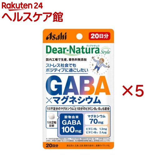お店TOP>健康食品>サプリメント>サプリメント成分 カ行(カキ)>GABA(ギャバ)>ディアナチュラスタイル GABA×マグネシウム 20日分 (40粒入×5セット)【ディアナチュラスタイル GABA×マグネシウム 20日分の商品詳細】●1日2粒あたり、GABA 100mg配合。●1日不足分※のマグネシウム 70mgに、さらにビタミンB6 1.3mg、ビタミンB12 2.4μgも一緒に摂れる。※令和4年国民健康・栄養調査(20歳以上、平均値)を摂取量、栄養素等表示基準値(18歳以上、基準値2200kcal)を必要量とし、摂取量が必要量を下回っている不足量を配合●穀物由来のGABAを使用●毎日続けやすい、1日2粒設計●品質のこだわり 国内工場で生産、着色料無添加【召し上がり方】1日2粒を目安に、水またはお湯とともにお召し上がりください。【品名・名称】GABA加工食品【ディアナチュラスタイル GABA×マグネシウム 20日分の原材料】マルチトール(国内製造)、GABA含有乳酸菌発酵エキス末、デンプン、植物油脂/セルロース、酸化Mg、デンプングリコール酸Na、ステアリン酸Ca、微粒酸化ケイ素、糊料(HPMC)、V.B6、V.B12【栄養成分】1日2粒(600mg)当たりエネルギー:1.8kcal、たんぱく質:0.10g、脂質:0.011g、炭水化物:0.32g、食塩相当量:0.00008〜0.0016g、ビタミンB6:1.3mg、ビタミンB12:2.4μg、マグネシウム:70mgGABA:100mg【アレルギー物質】記載なし【規格概要】内容量:40粒(1粒重量300mg)【保存方法】直射日光・高温多湿を避け、常温で保存してください。【注意事項】・食生活は、主食、主菜、副菜を基本に、食事のバランスを。・品質の不都合はお取替えします。★摂取上の注意・1日の摂取目安量を守ってください。・乳幼児・小児は本品の摂取を避けてください。・妊娠・授乳中の方は本品の摂取を避けてください。・治療を受けている方、薬を服用中の方は、医師にご相談の上、お召し上がりください。・小児の手の届かないところに置いてください。・体調や体質によりまれに身体に合わない場合があります。その場合は使用を中止してください。・原料由来の斑点が見られたり、色調やにおいが変化する場合があります。・開封後はお早めにお召し上がりください。・品質保持のため、開封後はチャックをしっかり閉めて保管してください。【原産国】日本【ブランド】Dear-Natura(ディアナチュラ)【発売元、製造元、輸入元又は販売元】アサヒグループ食品※説明文は単品の内容です。リニューアルに伴い、パッケージ・内容等予告なく変更する場合がございます。予めご了承ください。・単品JAN:4946842650996アサヒグループ食品130-8602 東京都墨田区吾妻橋1-23-1 アサヒグループ本社ビル ※お問合せ番号は商品詳細参照広告文責:楽天グループ株式会社電話:050-5577-5043[ミネラル サプリメント/ブランド:Dear-Natura(ディアナチュラ)/]