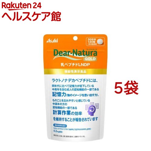 お店TOP>健康食品>サプリメント>サプリメント成分 ハ行>ペプチド>ディアナチュラ ゴールド 乳ペプチドLNDP 30日分 (120粒*5袋セット)商品区分:機能性表示食品(F301)【ディアナチュラ ゴールド 乳ペプチドLNDP 30日分の商品詳細】●記憶力※、計算作業の効率を維持することが報告されている ラクトノナデカペプチド配合。●機能性関与成分 ラクトノナデカペプチド(NIPPLTQTPVVVPPFLQPE)4.2mg配合。【保健機能食品表示】届出表示:本品には、ラクトノナデカペプチド(NIPPLTQTPVVVPPFLQPE)が含まれます。ラクトノナデカペプチド(NIPPLTQTPVVVPPFLQPE)には、ものごとを忘れやすいと感じている中高年の方の認知機能の一部である計算作業の効率、情報処理作業の効率の低下を感じている中高年を含む成人の認知機能の一部である視覚情報作業の効率(視覚情報を組み合わせて全体を推理する力)、同年代に比べて記憶力が低下している中高年を含む成人の認知機能の一部である記憶力(物のイメージを思い出す力)を維持することが報告されています。【1日あたりの摂取目安量】4粒【召し上がり方】・一日摂取目安量:4粒が目安・摂取方法:水またはお湯とともにお召し上がりください。【品名・名称】カゼイン加工食品【ディアナチュラ ゴールド 乳ペプチドLNDP 30日分の原材料】カゼイン酵素分解物(ニュージーランド製造)、乳糖、麦芽糖/ステアリン酸Ca、微粒酸化ケイ素、セラック【栄養成分】1日4粒(1808g)当たりエネルギー:6.8kcal、たんぱく質:0.97g、脂質:0.027g、炭水化物:0.67g、食塩相当量:0.033g★機能性関与成分:ラクトノナデカペプチド(NIPPLTQTPVVVPPFLQPE):4.2mg【アレルギー物質】乳【保存方法】・直射日光・高温多湿を避け、常温で保存してください。【注意事項】・食生活は、主食、主菜、副菜を基本に、食事のバランスを。・本品は、事業者の責任において特定の保健の目的が期待できる旨を表示するものとして、消費者庁長官に届出されたものです。ただし、特定保健用食品と異なり、消費者庁長官による個別審査を受けたものではありません。・本品は、疾病の診断、治療、予防を目的としたものではありません。・本品は、疾病に罹患している者、未成年者、妊産婦(妊娠を計画している者を含む。)及び授乳婦を対象に開発された食品ではありません。・疾病に罹患している場合は医師に、医薬品を服用している場合は医師、薬剤師に相談してください。・体調に異変を感じた際は、速やかに摂取を中止し、医師に相談してください。★摂取上の注意・一日摂取目安量を守ってください。・原材料表示をご確認の上、食物アレルギーのある方はお召し上がりにならないでください。・小児の手の届かないところにおいてください。・原料由来の斑点が見られる場合がありますが、品質に問題ありません。★保存方法の注意・開封後はお早めにお召し上がりください。・品質保持のため、開封後は開封口のチャックをしっかり閉めて保管してください。【原産国】日本【ブランド】Dear-Natura(ディアナチュラ)【発売元、製造元、輸入元又は販売元】アサヒグループ食品※説明文は単品の内容です。商品に関するお電話でのお問合せは、下記までお願いいたします。菓子、食品、健康食品、サプリメント、スキンケアなど:0120-630611ミルク、ベビーフード、乳幼児用品専用:0120-889283リニューアルに伴い、パッケージ・内容等予告なく変更する場合がございます。予めご了承ください。・単品JAN:4946842639816アサヒグループ食品130-8602 東京都墨田区吾妻橋1-23-1 アサヒグループ本社ビル ※お問合せ番号は商品詳細参照広告文責:楽天グループ株式会社電話:050-5577-5042[ビューティーサプリメント/ブランド:Dear-Natura(ディアナチュラ)/]