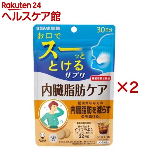 お店TOP>健康食品>機能性表示食品>イソフラボン(機能性表示食品)>UHA瞬間サプリ 内臓脂肪ケア 30日分 (60粒入×2セット)商品区分:機能性表示食品(I613)【UHA瞬間サプリ 内臓脂肪ケア 30日分の商品詳細】●サプリメントは面倒で薬みたいで苦手だと感じている方いませんか?UHAサプリシリーズはそんなあなたに「毎日おいしく楽しく続けるサプリ」をご提案!●速溶技術「瞬間崩壊製法」:口腔内の少ない水分(唾液)で即溶解される技術「瞬間吸収製法」を毎日続けるサプリメントで実現しました。崩壊剤を用いずに製法のみで速溶感を生み出すことで、唾液量の少ない方(高齢者やドライマウス患者)にも摂取していただけます。さらに溶解速度も速く溶けるように、改良を重ね、圧倒的速溶感を実現しております。●葛の花由来イソフラボンを2粒に22mg配合しております。●クラフトコーラ味でおいしく摂取できます。【保健機能食品表示】届出表示:本品には、葛の花由来イソフラボン(テクトリゲニン類として)が含まれます。葛の花由来イソフラボン(テクトリゲニン類として)には、肥満気味な方の、体重やお腹の脂肪(内臓脂肪と皮下脂肪)やウエスト周囲径を減らすのを助ける機能があることが報告されています。【1日あたりの摂取目安量】2粒【召し上がり方】1日1回2粒を目安に噛んでお召し上がりください。【品名・名称】葛の花抽出物含有食品【UHA瞬間サプリ 内臓脂肪ケア 30日分の原材料】エリスリトール(国内製造)、葛の花抽出物、ローズバッツ加工食品/酸味料、ステアリン酸Ca、香料、微粒二酸化ケイ素、甘味料(ステビア、アセスルファムK)、HPC、乳化剤、環状オリゴ糖、(一部に大豆を含む)【栄養成分】2粒(標準2g)当たりエネルギー:1.3kcal、たんぱく質:0.04g、脂質:0.03g、炭水化物:1.9g(糖類:0g)、食塩相当量:0.0009g機能性関与成分 葛の花由来イソフラボン(テクトリゲニン類として):22mg【アレルギー物質】大豆【規格概要】内容量:60g(1粒重量1g×60粒)【保存方法】直射日光・高温多湿を避け、保存してください。【注意事項】・本品は、多量摂取により疾病が治癒したり、より健康が増進するものではありません。・1日の摂取目安量を守ってください。・開封後はチャックをしっかり閉めてお早めにお召し上がりください。・通常喫食する間食の代替としてお召し上がりください。・体質によってお腹がゆるくなる場合があります。・のどに詰まらせないようご注意ください。・本品は、事業者の責任において特定の保健の目的が期待できる旨を表示するものとして、消費者庁長官に届出されたものです。ただし、特定保健用食品と異なり、消費者庁長官による個別審査を受けたものではありません。・本品は、疾病の診断、治療、予防を目的としたものではありません。・本品は、疾病に罹患している者、未成年者、妊産婦(妊娠を計画している者を含む。)及び授乳婦を対象に開発された食品ではありません。・疾病に罹患している場合は医師に、医薬品を服用している場合は医師、薬剤師に相談してください。・体調に異変を感じた際は、速やかに摂取を中止し、医師に相談してください。・本品は特定原材料のうち、乳を含む製品と共通の設備で製造しています。・パッケージの写真・イラストはイメージです。・時間の経過または湿気等により色が変化する場合があります。また、粒中に見られる斑点は原料由来のものであり、品質には問題ありません。・不都合品はお問合せ先にお送りください。・食生活は、主食、主菜、副菜を基本に、食事のバランスを。【原産国】日本【発売元、製造元、輸入元又は販売元】UHA味覚糖※説明文は単品の内容です。リニューアルに伴い、パッケージ・内容等予告なく変更する場合がございます。予めご了承ください。・単品JAN:4902750764910UHA味覚糖639-1031 奈良県大和郡山市今国府町137-50120-653-910広告文責:楽天グループ株式会社電話:050-5577-5043[機能性表示食品]