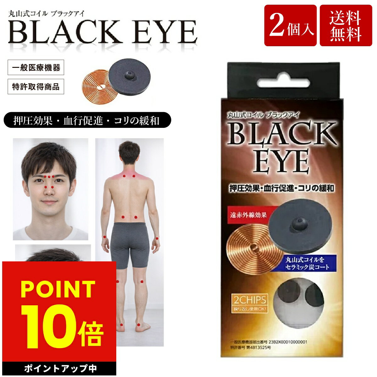 商品詳細 商品名 丸山式コイル ブラックアイ2個セット 商品説明 電流を打ち消す巻き方でつくられた特殊コイル(特許取得)と、静電気を減らす作用のある炭を組み合わせ作られた指先大の小さなコイルです。 ※ブラックアイ 一般医療機器届出番号:23B2X00010000001 セット内容 ブラックアイ:2個 貼替シール1シート:10枚×1枚 素材 ブラックアイ:銅線、スチレン系熱可塑性エラストマー、セラミック炭 貼替シール:綿、天然ゴム、合成ゴム、粘着付与材 サイズ ブラックアイ:直径13mm 厚さ 2.9mm(±10%) 貼替シール:直径23mm 区分 一般医療機器 医療機器届出番号 23B2X00010000001 製造国 日本 販売者 株式会社ユニカ 広告文責 株式会社エーウィル 0747-26-5566
