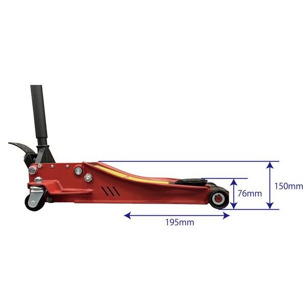 ・油圧式で楽にジャッキUP出来ます。 ・メーカー1年間保証付。 ・軽自動車?SUV・ミニバン・大型SUV車に最適です。 最大耐荷重:3000kg(最大揚程質量) 29.4kN 最低/最高地上高:約148mm/約530mm ストローク:約382mm ハンドルサイズ:約545mm ハンドル取付後全長:約1210mm サドルサイズ:約60×18(H)mm 作動油:油圧潤滑油(ISO VG32) 油量:約185cc 使用温度範囲:-20?60度 本体サイズ / 重さ:約705(W)×180(H)×185(D)mm /約18kg パッケージサイズ:約740(W)×195(H)×215(D)mm アウトカートンサイズ:約745(W)×200(H)×220(D)mm アウトカートンの重さ:約19.5kg 《使用上の注意》 ・車両をサイドからジャッキアップする場合、別売のジャッキアタッチメントをご使用ください。直接ジャッキアップすると、車両のジャッキセット位置が破損する場合があります。 ・本製品を業務用で使用しないでください。 ・本製品のハンドルはジャッキアップ・ダウン時以外は接触防止の為、必ずハンドルスリーブからはずしてください。 ・本製品は-20℃?60℃の範囲の温度環境で使用してください。1