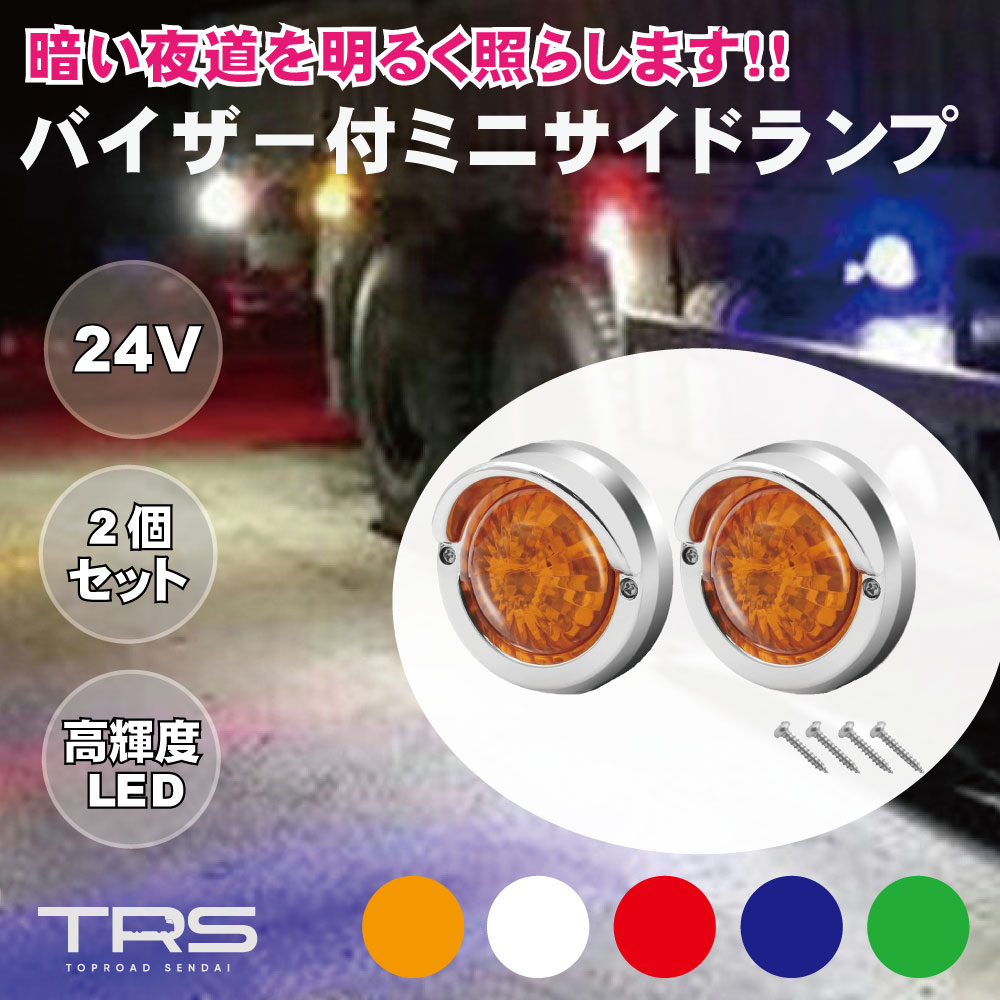 【商品名】 TRS バイザー付ミニサイドランプ 24V LED 2個セット ホワイト レッド アンバー ブルー グリーン 【商品説明】 ■バイザー付のオシャレなサイドランプ ■高輝度LED5発搭載しており視認性抜群! ■暗い夜道でも明るく輝きのある光を拡散し存在感を主張します。 ■ABS樹脂なので光沢性に優れ、耐熱性・耐寒性も抜群 【各種仕様】 ■入数:2個セット ■電圧:24V専用 ■品番・カラー (315135)ホワイト (315136)レッド (315137)アンバー (315138)ブルー (315139)グリーン ■消費電力:約 1.8W ■サイズ:直径 73mmφ×厚さ35mm (レンズ部直径65mm ネジピッチ65mm) ■材質:ABS樹脂ボディー+メッキフレーム+LED ■重量:55g (1個あたり) ■付属品:取付ビス ■配線:黒がマイナス (-) となります。 ■備考 ※完全防水ではありません。コーキング等防水加工して取付して下さい。 ※輸入品の為細かい小傷がある場合がございます。予めご了承下さい。 【関連キーワード】 バイザー付サイドランプ ミニサイドランプ 24V LEDサイドマーカー TRS トラック用ランプ ホワイトレンズ 高輝度LED ABS樹脂ボディ メッキフレーム トラックカスタム 外装ドレスアップ 補助灯 視認性向上 夜間走行用 デコトラ カスタムトラック 車幅灯 マーカーランプ 2個セット 耐熱性 耐寒性 軽量サイドランプ 白色LED トラックパーツ 直径73mm サイドマーカー24V トラック電装 カスタムパーツ