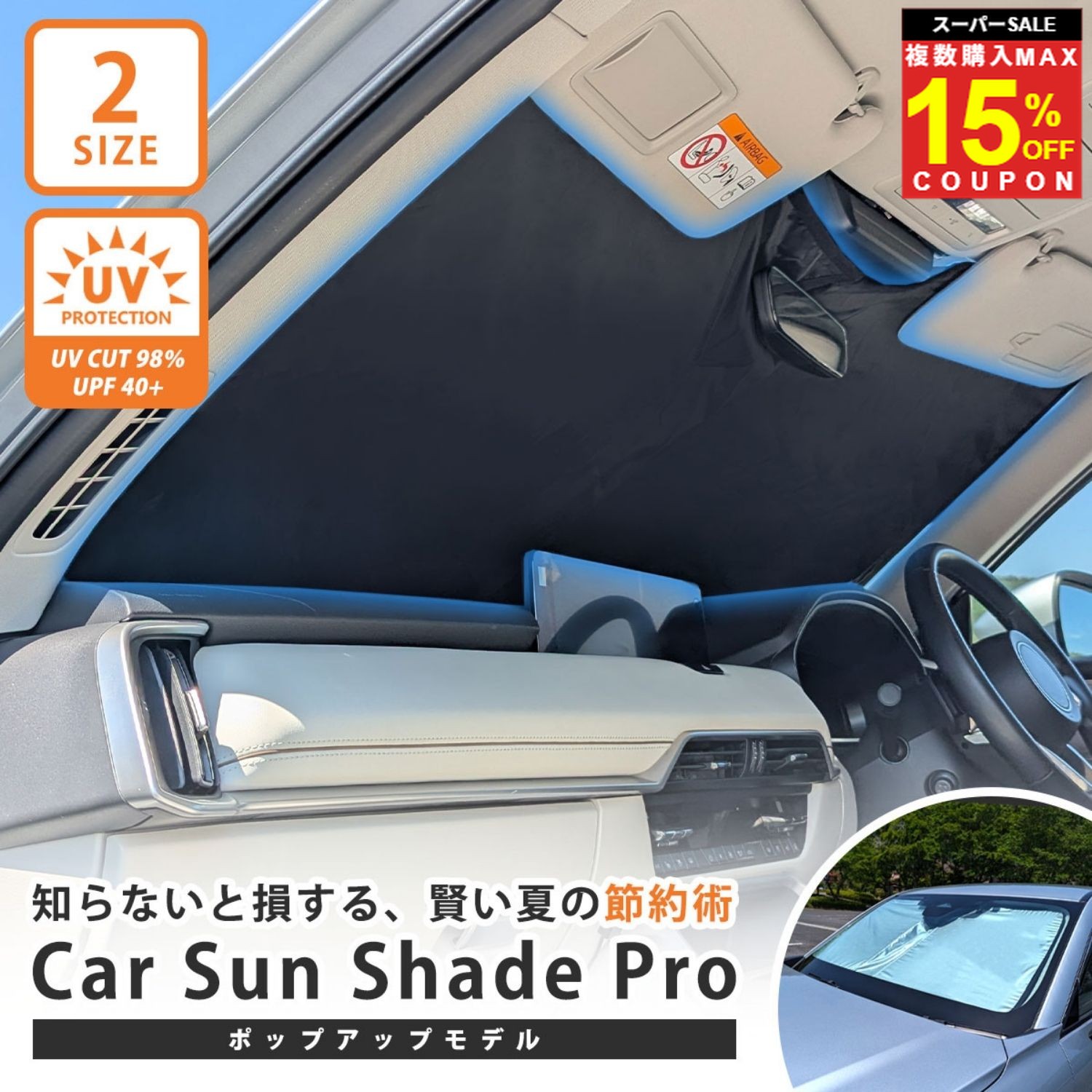 品 名サンシェード 車用サンシェード フロントガラスサンシェード 車サンシェード 折りたたみ コンパクト 軽量 パッと開けるポップアップ式 サンシェード 車 車用 フロントガラス フロント用 折りたたみ フロントサンシェード 軽 軽バン SUV ミニバン セダン 日除け UVカット 紫外線カット UV対策 紫外線対策 uv 紫外線 紫外線カット コンパクト 軽い 軽量 遮熱 遮断 収納ケース 傘タイプじゃない 傘じゃない カー用品 カーグッズ おススメ ランキング 便利グッズ 節約 夏の節約 燃費向上 燃費改善 エアコン エアコンの効き 早く冷える 直射日光 フレーム 枠 角 収納ケース付特徴・本製品は【UPF40+】の紫外線防止性能を備え、約98%紫外線(UV)をしっかりブロック。日差しの強い日でも紫外線からしっかり守ります。UPF(Ultraviolet Protection Factor)とは、衣類や生地がどれだけ紫外線を防ぐかを示す指数で、UPF40+は「非常に優れた紫外線防止効果」があると評価されています。 ・車内に傷がつきにくい パッと開けるポップアップ式サンシェード ・車内温度が高くなる 夏 高温 直射日光 エアコンが効き始めるまでの時間を短縮する事で、燃費の改善、お財布に優しい エコサンシェード 物価高で色々な支出が増える中、賢く節約。紫外線カット 指標UPF40+ UVカット約98%注意事項・汎用品の為、お車のフロントガラスのサイズによっては十分な遮光感を得られない場合があります。 ご購入前にはフロントガラスのサイズを車内から計測頂き、サイズをご検討ください。 ・必ずサンバイザーを使ってサンシェードを固定して下さい。 ・ドライブレコーダーや各種センサーをフロントガラスに設置されている場合、サンシェードが干渉して光が漏れてしまう事がありますのでご注意下さい。 ・本製品は海外製造・輸入品のため、入荷時のロット差や輸送時の影響により、軽度の擦れ・小傷・折りシワ等が見られる場合がございます。使用上の機能・性能には影響ございません。外観上の個体差として、あらかじめご了承ください。 関連商品\楽P20倍★4日20時〜/《後部座席を特等席にする》 タブレットホル...\楽P20倍★4日20時〜/【4冠達成】《天井に収納スペースを》 天井...\楽P20倍★4日20時〜/スマホホルダー スマホスタンド 車載ホルダ...2,380円1,980円2,050円\楽P20倍★4日20時〜/【楽天売れた物上半期TOP20入賞】 スマ...\楽P20倍★4日20時〜/【ランキング2位】 スマホホルダー 車 車...\楽P20倍★4日20時〜/スマホホルダー 車載ホルダー 車用 スマホ...1,980円1,930円1,950円\楽P20倍★4日20時〜/【グリップ3つの車でも使える】 天井ネット...\楽P20倍★4日20時〜/ スマホホルダー 車 吸盤式 強力固定 回...\楽P20倍★4日20時〜/ タブレット タブレットホルダー スマホ ...2,180円1,680円1,850円知らないと損する、賢い夏の節約術 Car Sun Shade Pro 使ってない人は時間もコストも損してる? 真夏のお車の環境を本気で考えてみた Car Sun Shade Pro ■物価高の今だから”節約”サンシェード 食料品・ガソリン代・生活雑貨…あらゆるものが物価高になっている今だから、ちょっとした知恵で毎日の節約を。 Car Sun Shade Pro は、目に見えないコストを減らして、お車の燃費、お財布にも環境にも優しい。 ・車内の熱さを軽減 ・暑さを軽減するからエアコンの効き始めが早い ・ハンドル、シートなどの経年劣化を防ぐ ・車内の精密機器への高温ダメージの軽減 ポップアップ式だからパッと開いて20秒セット。 Car Sun Shade Pro ならちょっとした手間で沢山の節約効果が期待できます。 ■安心の紫外線カット指数 UPF40+ 紫外線98%カットで車内をガード 断熱・吸熱・反射のトリプル効果で 車内温度を20℃以上下げる 体感温度を30%軽減 傘タイプなどに比べて、しっかりと厚みのある生地を使っているので遮光 遮熱効果もバッチリ♪ ■サイズ ・Sサイズ… 70cm*140cm 303g 軽自動車 軽バン コンパクトSUVなど ・Mサイズ… 77cm*142cm 324g セダン SUV ミニバンなど ■注意 ・本品は汎用品の為、事前にフロントガラスのサイズを車内から計測・確認してからご検討ください。 ・ワンボックスカーでのご使用について ワンボックスカーやフロントガラスが大きなお車へ取り付ける場合、本製品(Mサイズ)でもやや小さめなサイズ感となります。 フロントボードからサンバイザーに立て掛けるイメージでの設置となりますのでご了承下さい。 ・ドライブレコーダーや各種センサーをフロントガラスに設置されている場合、サンシェードが干渉して光が漏れてしまう事がありますのでご注意下さい。 ・本製品は海外製造・輸入品のため、入荷時のロット差や輸送時の影響により、軽度の擦れ・小傷・折りシワ等が見られる場合がございます。使用上の機能・性能には影響ございません。外観上の個体差として、あらかじめご了承ください。 【配送について】 こちらの商品は、【佐川急便 飛脚宅配便】にて発送を予定しております。 複数でのご注文・別商品と同時ご購入・配送先地域によっては発送方法が変更する場合があります。予