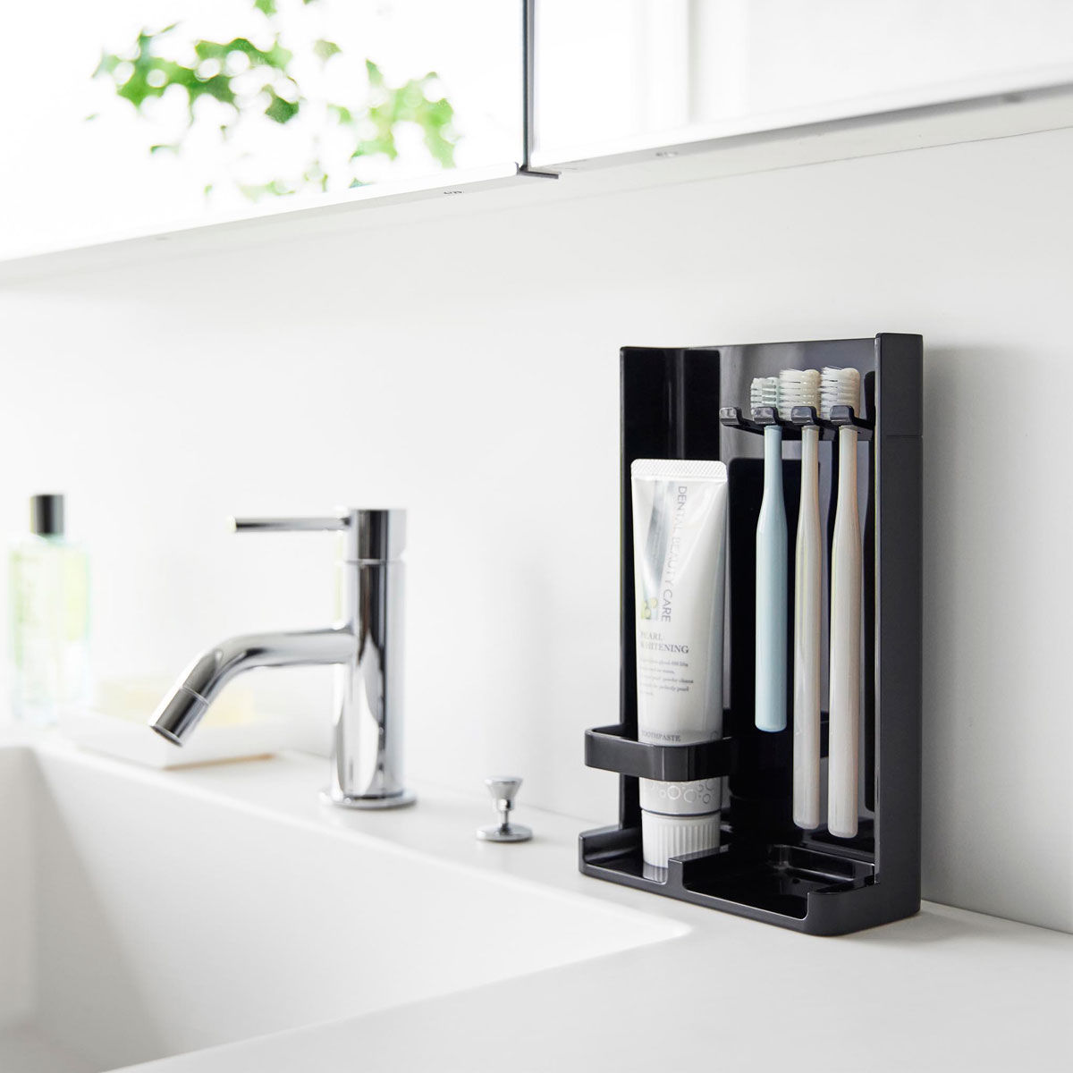 シンプルに整頓で快適ケア! 歯ブラシ&チューブスタンドは、シンプルなデザインで歯ブラシ5本と歯磨き粉チューブ2本をスッキリ収納。来客などで隠したい時はサッと裏返して目隠し収納できます。歯ブラシは掛けるだけの簡単収納で便利。 サッと裏返して目隠し収納! tower 目隠し歯ブラシ&チューブスタンドなら、シンプルなデザインでスッキリ整頓します。電動歯ブラシや替えブラシの収納も快適。トレーは本体から外してお手入れ簡単。移動も楽々です。 商品の情報 ・ブランド:YAMAZAKI(山崎実業)/日本 ・ジャンル:歯ブラシスタンド ・主な素材:ABS樹脂(本体、トレー)/シリコーン(底面キャップ) ・生産国:中国 ・サイズ:約W222xD60xH212mm(本体)/約W8xD15xH170mm(歯ブラシホルダー部 1つあたり)/約W75xD44xH52mm(チューブホルダー部) ・重量:260g ・収納可能数:歯ブラシ5本/歯磨き粉チューブ2本 この商品の仲間たち 正規品 tower タワー 目隠し歯ブラシ&チューブスタンド ホワイト 正規品 tower タワー 目隠し歯ブラシ&チューブスタンド ブラック