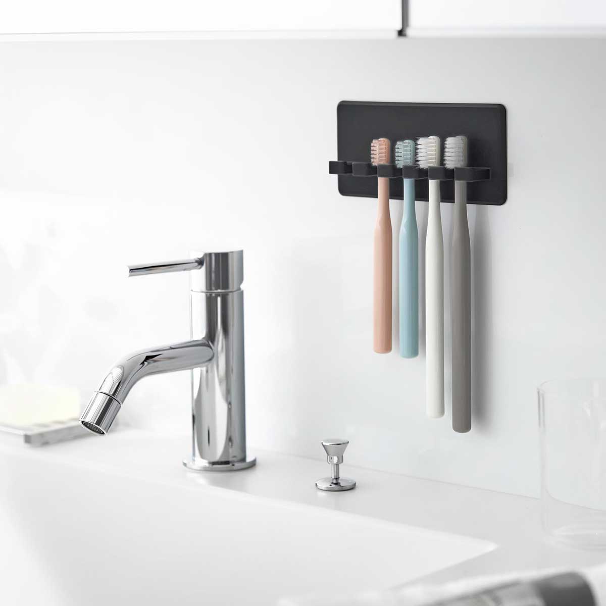 フィルムフック替え歯ブラシホルダータワー フィルムフックで壁面収納 替え歯ブラシ用ホルダー 洗面所の壁面やタイルに貼り付けて、電動歯ブラシの交換用ヘッドを浮かせて収納できる『 tower( タワー )フィルムフック替え歯ブラシホルダー 』。貼ってはがせる粘着シールタイプで、サニタリーのお好きな高さに設置できます。家族分の交換用歯ブラシヘッドを掛けられる4連タイプで、歯ブラシ収納のほかシェーバーやヘアゴム収納にもおすすめ。浮かせる収納で洗面台のお掃除がしやすく、ホルダーは外せて丸洗いOK。壁付けできるスタンドで水回りが清潔に整います。 スペック 品名 tower( タワー )フィルムフック替え歯ブラシホルダー 品番 / JAN ホワイト:10223 / 4903208102230ブラック:10224 / 4903208102247 サイズ 外寸:約 幅 110mm×奥行き 45mm×高さ 40mm( フィルムフック・クッション含まず )フィルムフック接着面:約 幅 60mm×高さ 60mm 重さ 約 90g 素材 本体:スチール( ユニクロメッキ+粉体塗装 )クッション:エラストマーフィルムフック:ポリカーボネート、PET、ポリウレタン 耐荷重 約 1kg( ホルダー1つあたり250g )※静止荷重です。設置面の表面加工、材質、状態、塗装、強度、環境などによって異なります。 耐熱温度 フィルムフック:60℃ 耐冷温度 フィルムフック:?40℃ 取り付け可能な場所 ・フィルムフックの接着面よりも大きい面 ・平らで光沢のある油染みしない面( タイル、プラスチック面、ステンレス、金属塗装面、人工大理石 ) ※設置面の表面加工、材質、状態、環境などによっては、貼り付けできない場合があります。 ※ガラス、鏡面、タイルの目地、ヘアラインのあるステンレス、マット仕上げの人工大理石、電子レンジやストーブの金属塗装面には使用できません。 付属品 クッション×2、フィルムフック お手入れ ・本体の汚れが目立つ場合は、中性洗剤を含ませたやわらかいスポンジなどで洗い、よくすすいで水分を拭き取り乾燥させてください。 ・カビ取り剤や漂白剤、アルコールなどの薬品、ベンジンやシンナーなどの溶剤、タワシ、磨き粉は使用しないでください。 ・フィルムフックの表面、接着面は洗剤を使用せず水洗いをしてよく乾かしてください。 ・フィルムフックに熱湯( 60℃以上 )をかけたり、お湯や水につけたまま放置したりしないでください。 備考 ・フィルムフックを定着させるために、貼り付け後30分以上置いてから使用してください。 ・フィルムフックは接着面をお手入れすれば繰り返し使用できますが、粘着力は徐々に低下していきます。 ご注意点 ※製品仕様やパッケージは改良のため予告なく変更される場合があります。 ※サイズや色味は個体により若干の差異が生じることがあります。 ※商品の色は、画面上の画像と実物とでは多少異なる場合があります。あらかじめご了承のうえ、お買い求めください。 ※重量の偏りのないよう、バランスよく収納してください。 ※サイズや形状によっては収納できないものもあります。 ※直接水がかかる場所では、フィルムフックの粘着力が弱くなる場合があります。 ※直射日光の当たる場所や火の近く、高温になる場所、小さなお子さまやペットが触れるところ、屋外、万一落下した場合危険な場所では使用しないでください。 山崎実業 公式 オンラインショップ 【DR00040】tower タワー( 山崎実業 ) フィルムフック替え歯ブラシホルダー 10223 / 10224 フィルムフックで壁面収納替え歯ブラシ用ホルダー 洗面所の壁面やタイルに貼り付けて、電動歯ブラシの交換用ヘッドを浮かせて収納できる『 tower( タワー )フィルムフック替え歯ブラシホルダー 』。貼ってはがせる粘着シールタイプで、サニタリーのお好きな高さに設置できます。家族分の交換用歯ブラシヘッドを掛けられる4連タイプで、歯ブラシ収納のほかシェーバーやヘアゴム収納にもおすすめ。浮かせる収納で洗面台のお掃除がしやすく、ホルダーは外せて丸洗いOK。壁付けできるスタンドで水回りが清潔に整います。 Point 電動歯ブラシのヘッドを収納 貼ってはがせるフィルムフックで壁面に取り付けて、電動歯ブラシの交換用ヘッドを掛けられる収納ホルダー。浮かせて収納できるので洗面台のスペースを圧迫せず、衛生的に収納できます。インテリアになじむモノトーンカラーのシンプルなデザインです。 フィルムフックで簡単設置 設置したい場所にフック付き透明フィルムを貼って、ホルダーを差し込むだけの簡単取り付け。使いやすい場所に設置できるうえ、はがして貼り直すことも可能です。 家族で使える4連タイプ電動歯ブラシの付け替え用ヘッドを最大4本収納できるので、家族4人分ならまとめて掛けられます。定位置を決めておけば、毎日の歯磨きもスムーズ。フレームタイプで乾きやすいから清潔を保ちやすく、前面に立ち上がりがあるので収納時の安定感も◎です。 タイル壁にも取り付け可 フィルムフックの接着面より広くて光沢がある面であれば、タイル面にも設置できま