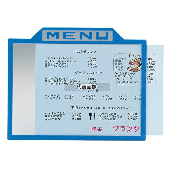 商品の特徴 メニューパネル (B5サイズ) 青 ●使い方はいたって簡単!コピーサイズ用紙(A5・B5・A4・B4)にワープロやパソコンでメニューを印刷し、横から挿入するだけ。 ●差し換えは自在ですから、洋食、喫茶、食堂のみならず、おすすめ品、季節メニューの紹介など巾広くお使い頂けます。 ●いずれのタイプも記入用紙2枚入。静電気防止タイプシート使用 製品仕様 ●商品ブランドシリーズ:プラビック ●品名情報分解1 物:メニュー ●品名情報分解2 色:青 ●外寸:205×278/ JANコード:4980751205021