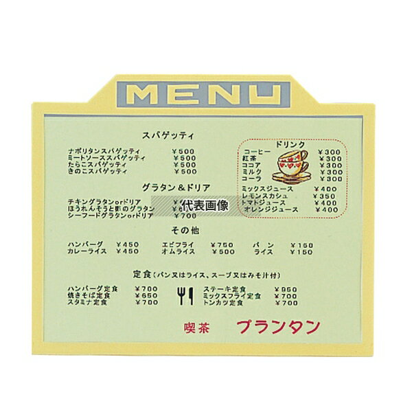 商品の特徴 メニューパネル (B5サイズ) コルク ●使い方はいたって簡単!コピーサイズ用紙(A5・B5・A4・B4)にワープロやパソコンでメニューを印刷し、横から挿入するだけ。 ●差し換えは自在ですから、洋食、喫茶、食堂のみならず、おすすめ品、季節メニューの紹介など巾広くお使い頂けます。 ●いずれのタイプも記入用紙2枚入。静電気防止タイプシート使用 製品仕様 ●商品ブランドシリーズ:プラビック ●品名情報分解1 物:メニュー ●外寸:205×278/ JANコード:4980751205038