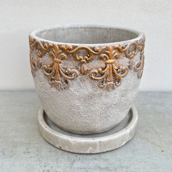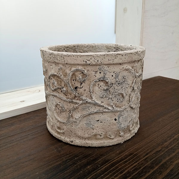 鉢 ラウンド型 クラシックモチーフが引き立てるセメントポット COVENTアラベスク・ラウンドポット (QO-10) 4個セット重厚な質感のセメント素材に、繊細な装飾模様をあしらったデザインポット。上部のレリーフは、クラシカルでどこかヨーロッパを感じさせる趣があり、植物をより上品に引き立ててくれます。ナチュラルカラーなので植物とも相性がよく、置く場所を選びせん。付属の受け皿付きで機能性も十分。小ぶりながら存在感があり、玄関や窓辺のアクセントにもぴったりです。 底穴がありますので、直接植物を植え込んでください。サイズ(約)直径14cm、高さ12cm口径(約)直径12cm、深さ11.5cmソーサーサイズ(約)直径13.5cm、高さ1.5cmソーサー内寸(約)直径12cm、深さ0.5cm材質セメント底穴あり※表示寸法は、実物と多少の違いが出る場合があります。※写真はイメージです。※植物、撮影資材などは含まれておりません。