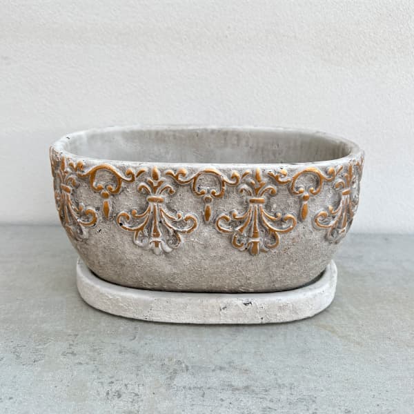 鉢 オーバル型 クラシックモチーフが引き立てるセメントポット COVENTアラベスク・オーバルポットS(QO-08) 4個セット重厚な質感のセメント素材に、繊細な装飾模様をあしらったデザインポット。上部のレリーフは、クラシカルでどこかヨーロッパを感じさせる趣があり、植物をより上品に引き立ててくれます。ナチュラルカラーなので植物とも相性がよく、置く場所を選びません。付属の受け皿付きで機能性も十分。小ぶりながら存在感があり、玄関や窓辺のアクセントにもぴったりです。底穴がありますので、直接植物を植え込んでください。サイズ(約)幅18cm、奥行き11cm、高さ9cm口径(約)幅17cm、奥行き9cm、深さ8cmソーサーサイズ(約)幅18cm、奥行き10cm、高さ2cmソーサー内寸(約)幅16cm、奥行き8cm、高さ0.5cm材質セメント底穴あり※表示寸法は、実物と多少の違いが出る場合があります。※写真はイメージです。※植物、撮影資材などは含まれておりません。