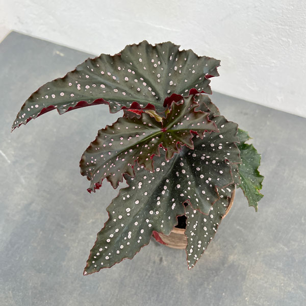 木立ベゴニア 水玉模様が素敵なベゴニア観葉植物/ベゴニア:リトルミスマミー 4号鉢植えベゴニアリトルミスマミーは水玉模様が素敵な葉を楽しむベゴニアです。木立性ベゴニアは球根が無く茎が直立するベゴニア(多年草)です。葉の模様が美しく、春から晩秋まで繰り返し花を咲かせます。日陰に強いため屋内でも栽培でき、世界的に人気が高く交配が盛んで、数百種が流通しています。室内やベランダ、玄関前、お庭といろいろなシーンにご利用ください。英名Little Miss Mummeyタイプシュウカイドウ科の半耐寒性多年草植え付け適期4月〜9月日照日陰〜半日陰向き育て方:お届けした鉢のままで1年間くらいは管理できます。暗い場所に強いので、室内・戸外の日陰になる場所で管理できますが、花をよく咲かせるには、春と秋は屋外の日当たり、夏は屋外の半日陰、冬は室内の明るい窓辺に置くのが理想的です。夏の高温多湿は苦手なので風通しのよい涼しい場所で育て、水のやりすぎに注意します。冬は屋内に取り込み、5度以上で管理します。春から秋の生育期は1ヶ月に1〜2回程度、規定倍率に薄めた液肥を与えてください。花は新しく伸びた太く充実した枝につくので、花付きの悪い古い茎や伸びすぎが茎は切り戻します。木質化した茎も根元から切ります。根茎が横に張り出すように伸びてきたら一回り大きな鉢に植え替えてください。※写真はイメージです。 ■お届け地域につきまして・冬季は寒冷地や配送日数のかかる地域へのお届けができません。(概ね12〜3月、北海道、東北、沖縄、離島など)・但し個別の植物の耐寒温度により、お届け可能であればご相談させていただく場合があります。 ベゴニア:リトルミスマミー 4号鉢植えの栽培ガイドベゴニアの冬越し観葉植物の管理方法