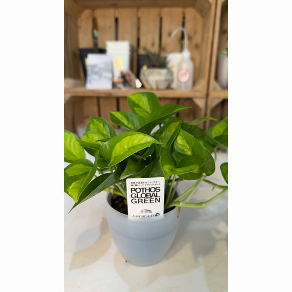 浅岡園芸オリジナル 濃緑葉にライムグリーンの不規則な葉が美しい観葉植物観葉植物/ポトス:グローバルグリーン3号ポット潤流鉢(穴ナシ鉢カバー入り)入り浅岡園芸さんの育てたポトスグローバルグリーンです。浅岡園芸さんのオリジナル品種です。潤流鉢とのセットです。グローバルグリーンはライムグリーンの美しい斑が濃い緑の葉に不規則に入る、迷彩模様のような葉が魅力のポトスです。室内の明るい場所なら元気に育ってつやのある美しい葉を茂らせます。複数の枝が株元からピンチ(剪定)されている場合がありますが、小さくてもボリュームのある丈夫な作りの株にするための仕立てですのでご了承ください。従来のポトスよりも丈夫で育てやすく、寒さにも強い品種です。「潤流(じゅんりゅう)」とは、アロイダーズ浅岡園芸が提唱する観葉植物の水やり方法で、上からたっぷりの水を与えて鉢全体を均一に潤し、受け皿に水を溜めておくことで乾燥を防ぎ、根が心地よく水分を保てる状態を維持することです。水やりの際は鉢にたっぷり水を通して、新鮮な水を1cm程度ためておいてください。タイプサトイモ科エプピレムヌム属 原産地ソロモン諸島日照明るい半日陰を好む耐寒温度5℃以上栽培方法:半日陰でもよく育ちますが、夏以外は南向きの窓辺などなるべく明るい光にあてた方が葉色が鮮明になります。冬場は乾燥気味に管理し、少しずつ慣らした状態で5℃以上を保つと十分に越冬します。育成期の5〜9月頃は、定期的(2週間に1回程度)に液体肥料を施して下さい。エアコンの側に置くとエアコンの風で葉が傷みますので、なるべくエアコンから離してください。葉についたほこりは時々拭いてください。徐々につるが伸びていきますが、古いつるの部分の葉が落ちて見苦しくなった場合は、思い切って根元から3節くらいの場所で切り戻してください。1か月ほどすると切り口の側から新芽が出てきれいな株姿に戻ります。根詰まりしてくると下葉が黄色くなり生育不良になるので、新しい土を用いて植え替えてください。また、切り取った枝を水を入れたコップに挿しておくと発根しますので、土に植え替えてください。※写真はイメージです。 ■お届け地域につきまして・冬季は寒冷地や配送日数のかかる地域へのお届けができません。(概ね12〜3月、北海道、東北、沖縄、離島など)・但し個別の植物の耐寒温度により、お届け可能であればご相談させていただく場合があります。 ポトス:グローバルグリーン3号ポット潤流鉢(穴ナシ鉢カバー入り)入りの栽培ガイド観葉植物の管理方法