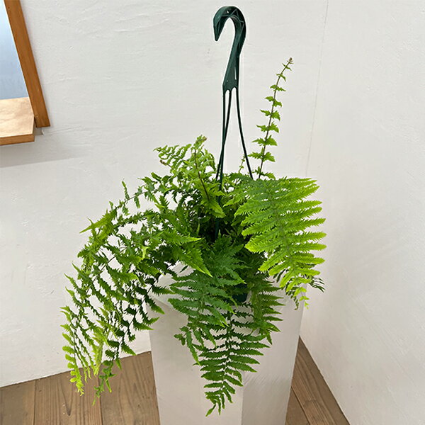 シダ植物の仲間観葉植物/ドリナリア:クエルシフォリア 3.5号吊り鉢ドリナリア クエルシフォリアはインド・中国南部などが原産地の着生シダの仲間です。乾燥した樹上で生活するため、ユニークな形の枯れたような泥除け葉をもち、この中に落ち葉などをためてで貯水します。半日陰の風通しのよい場所で管理し、株元が乾いたら水を与えて下さい。葉にも霧吹きで水を与えて下さい。この泥除け葉はネストリーフとも呼ばれ、とても美しいので人気があります。枯れたように見えてもカットせずにそのまま鑑賞してください。半日陰の場所を好みます。学名Drynaria quercifoliaタイプウラボシ科ハカマウラボシ属 育て方:風通しの良い、10度以下に気温が下がらないような場所で管理し、一年を通して直射日光を当てずにレースのカーテン越しの光を当ててください。冬以外は土の表面が乾いたらたっぷりの水を与えてください(冬は土が完全に乾いてから)。 受け皿に溜まったお水は捨て、葉水や霧吹きで葉の表面の乾燥を防ぎます。※写真はイメージです。ドリナリア:クエルシフォリア 3.5号吊り鉢の栽培ガイド日陰の庭におすすめのカラーリーフ観葉植物の管理方法