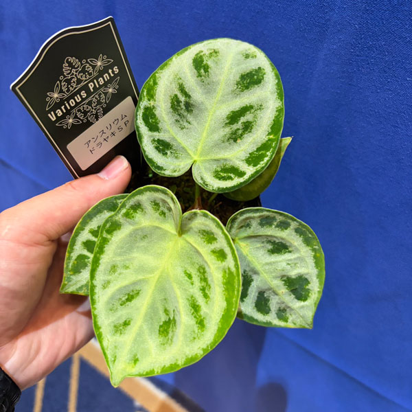 葉を楽しむ原種アンスリウム クイーンオブアンスリウム 現品販売観葉植物/アンスリウム:ワロクアナム ミューテーション 3.5号ポット★現品販売★斑の入った変異葉が出てきたアンスリウムワロクアナムです。花ではなく、美しい葉を楽しむ観葉植物の原種アンスリウムです。アンスリウムワロケアナムは「クイーン・オブ・アンス」とも呼ばれ、葉が大きく成長します。黒々とした光沢のある深緑色の葉と、美しい白色の葉脈が目を引きます。原種のアンスリウムは世界に600種以上あり、地生もしくは樹木等に着生し、茎が蔓性になるものや、ロゼット状・直立するもの等があります。花に観賞価値はほとんどありませんが、ワイルドで力強い美しさが魅力です。アンスリウムはとても丈夫で日陰にも強い植物。室内での管理もほとんど手間がかからず、手軽にお楽しみいただけます。※葉に傷がある場合がございますが、植物の成長のため、そのままつけてお届けいたします。タイプアンスリウム属の非耐寒性多年草学名Anthurium warocqueanum耐寒性5度まで(20度以上であれば年間を通して生育を続けます)日照半日陰むき(遮光率15〜40%)育て方:室内で管理します。高温・多湿を好みますが、鉢土が常時湿った状態にしておくと根腐れすることがありますのでご注意ください。鉢土はあまり加湿せずに、葉水などを与えてください。寒さにはやや弱いので、通年暖かい室内で管理するとよいでしょう。生育期に置肥を控えめに与えます。■ご注意・現品販売です。写真はお届けする株の画像ですが、植物は日々生育等により状態が変化するため、お届け時に株姿が若干異なる場合があります。・複数店舗で同時販売しているため、ご注文のタイミングにより、商品がお届けできなくなる場合があります。ご注文受付後に在庫確認を行い、改めてメールにてご連絡いたします。 ■お届け地域につきまして・冬季は寒冷地や配送日数のかかる地域へのお届けができません。(概ね12〜3月、北海道、東北、沖縄、離島など)・但し個別の植物の耐寒温度により、お届け可能であればご相談させていただく場合があります。 アンスリウム:ワロクアナム ミューテーション 3.5号ポットの栽培ガイド観葉植物の管理方法インテリアにおすすめの、縁起の良い観葉植物インテリアで長く楽しめる花観葉・アンスリウム