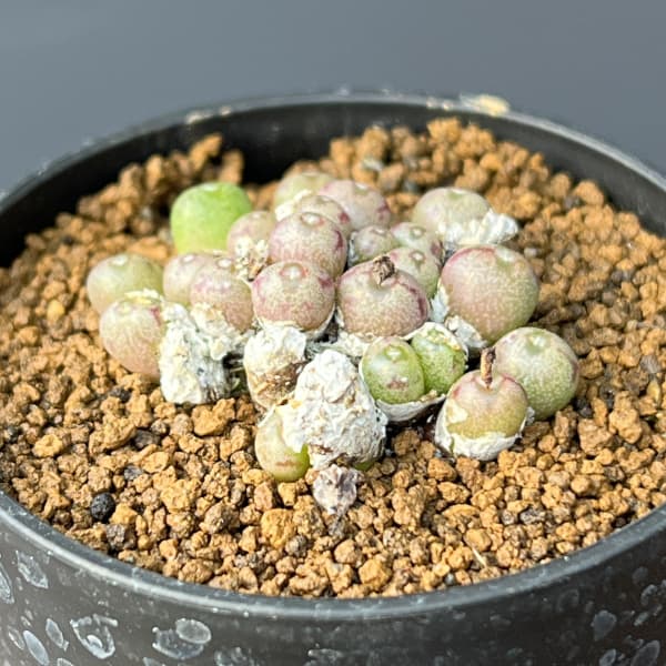 メセン・女仙の仲間 ミニスクルム ミヌスクラム観葉植物/コノフィツム(原種系):ミヌスクルム 2.5号ポットコノフィツムは、メセン(女仙)の仲間の多肉植物。丸型や足袋型などの面白い形をした単幹の葉(芽)が1株で、複数の芽が群生して育ちます。葉の色も緑色からクリーム色、白っぽいものなどさまざまです。秋に、葉の中心の割れ目からマツバギクのようなかわいい花を咲かせます。花の色もさまざまで可憐です。同じメセンの仲間のリトープスと同じく「脱皮」をする植物です。年1回、休眠前に外側にある古い葉が枯れ、秋にその中から新しい葉が出てきます。タイプハマミズナ科コノフィツム属の宿根性多肉植物越冬温度5度以上日照日なた栽培方法:出来るだけ日当たり、風通しの良い場所に置きます。夏季休眠期となりますので、水やりはせず遮光できる場所で管理します。高温多湿は弱く腐りやすいです。暑さが少し落ち着いてきた9月中〜下旬より生育が始まりますので水やりを開始してください。水やりは、2〜3週間に一回程度おこないます。肥料はほとんど必要ありません。用土は多肉・サボテン用のものでよく、できるだけ水はけの良い物にしてください。冬は日当たりの良い室内やフレームの中で管理してください。 ■お届け地域につきまして・冬季は寒冷地や配送日数のかかる地域へのお届けができません。(概ね12〜3月、北海道、東北、沖縄、離島など)・但し個別の植物の耐寒温度により、お届け可能であればご相談させていただく場合があります。 ※写真はイメージです。コノフィツム(原種系):ミヌスクルム 2.5号ポットの栽培ガイド観葉植物の管理方法