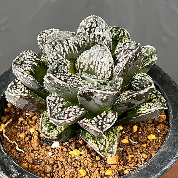 カクタス・ニシ セレクト品種観葉植物/ハオルチア:サウロン(モルドール大型変異株)3.5号鉢植え★現品販売★ハオルチア モルドールはウィミーの交配種で、葉は短い丸葉で黒くごつごつした肌が特徴です。透明窓の美しい人気のハオルチアです。ハオルチアはぷにぷにとした姿のかわいい多肉植物。南アフリカのケープ地方などに自生する多肉植物の仲間です。多肉植物の中では最も小型で強健な種が多いのが特徴です。乾燥に強く、耐陰性もあるので、室内での栽培にも向いています。学名Haworthiaタイプユリ科ハウォルチア属の多肉植物越冬温度5度以上日照半日陰栽培方法:明るい日陰を好みます。葉焼けを起こしますので直射日光は避けましょう。夏の高温に弱く、夏季休眠期となりますので、水やりはせず遮光できる場所で管理します。高温多湿には弱く腐りやすいです。暑さが少し落ち着いてきた9月中〜下旬より生育が始まりますので水やりを開始してください。水やりは、2〜3週間に一回程度おこないます。肥料はほとんど必要ありません。用土は多肉・サボテン用のものでよく、できるだけ水はけの良い物にしてください。冬は日当たりの良い室内やフレームの中で管理してください。■ご注意・現品販売です。写真はお届けする株の画像ですが、植物は日々生育等により状態が変化するため、お届け時に株姿が若干異なる場合があります。・複数店舗で同時販売しているため、ご注文のタイミングにより、商品がお届けできなくなる場合があります。ご注文受付後に在庫確認を行い、改めてメールにてご連絡いたします。※この商品は事前に商品写真を送ることができます。ご希望の場合はメールにてお問合せください。ハオルチア:サウロン(モルドール大型変異株)3.5号鉢植えの栽培ガイド観葉植物の管理方法